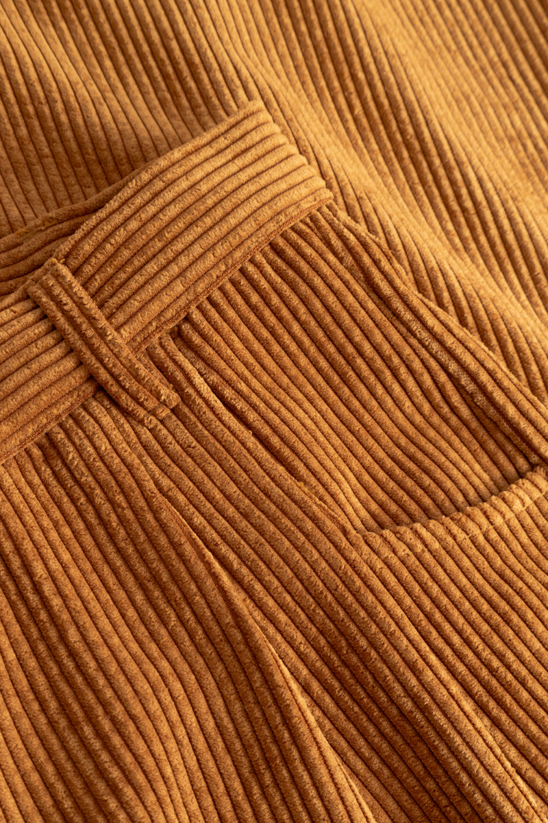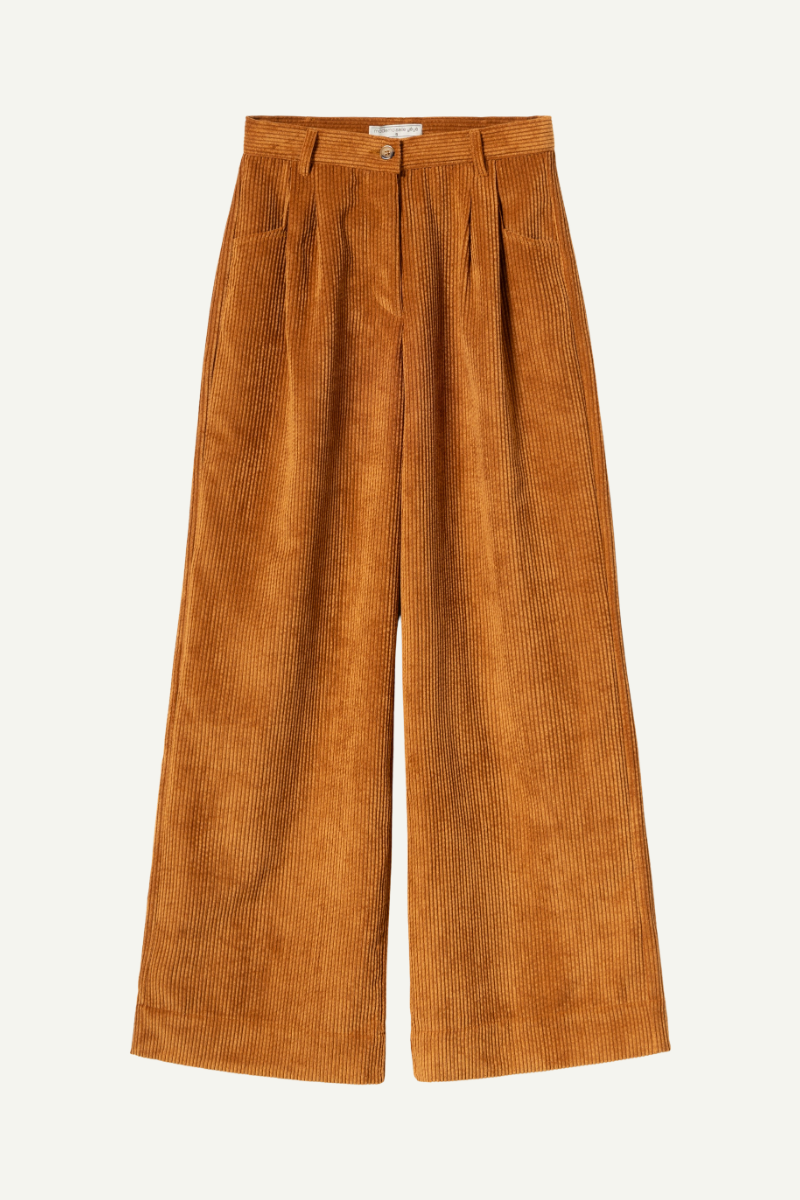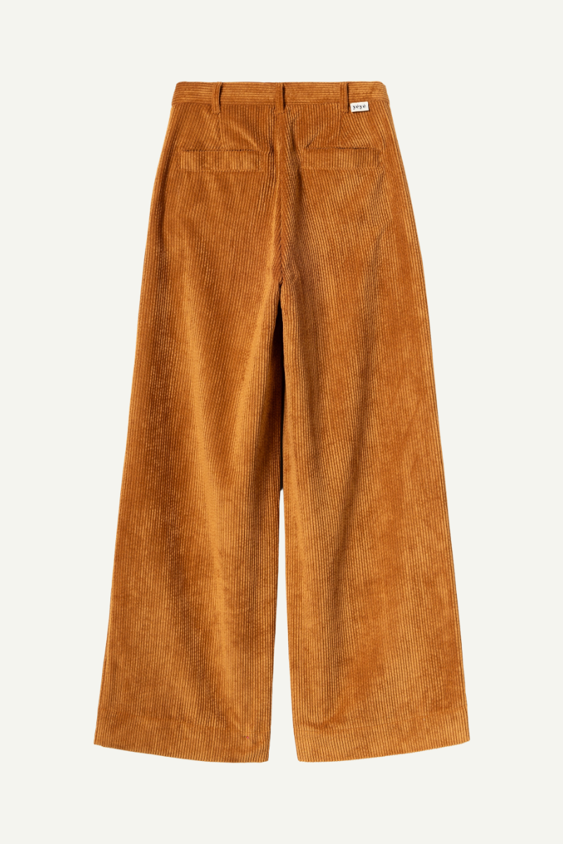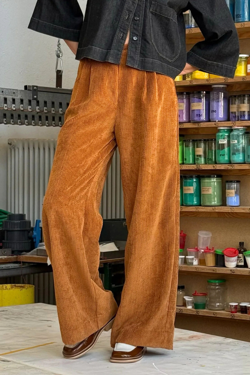 Die Hose Gig Ready Brown von Mademoiselle YéYé vereint klassischen Stil mit modernem Komfort. Der weiche Kordsamt sorgt für ein angenehmes Tragegefühl, während die Bundfalten und das lange, weite Bein eine elegante Silhouette schaffen. Praktische Eingriffstaschen vorne und Klappentaschen mit Knopf hinten bieten ausreichend Stauraum – ideal für den lässigen Alltag oder besondere Anlässe. Ein Must-have, das vielseitig und zeitlos begeistert.