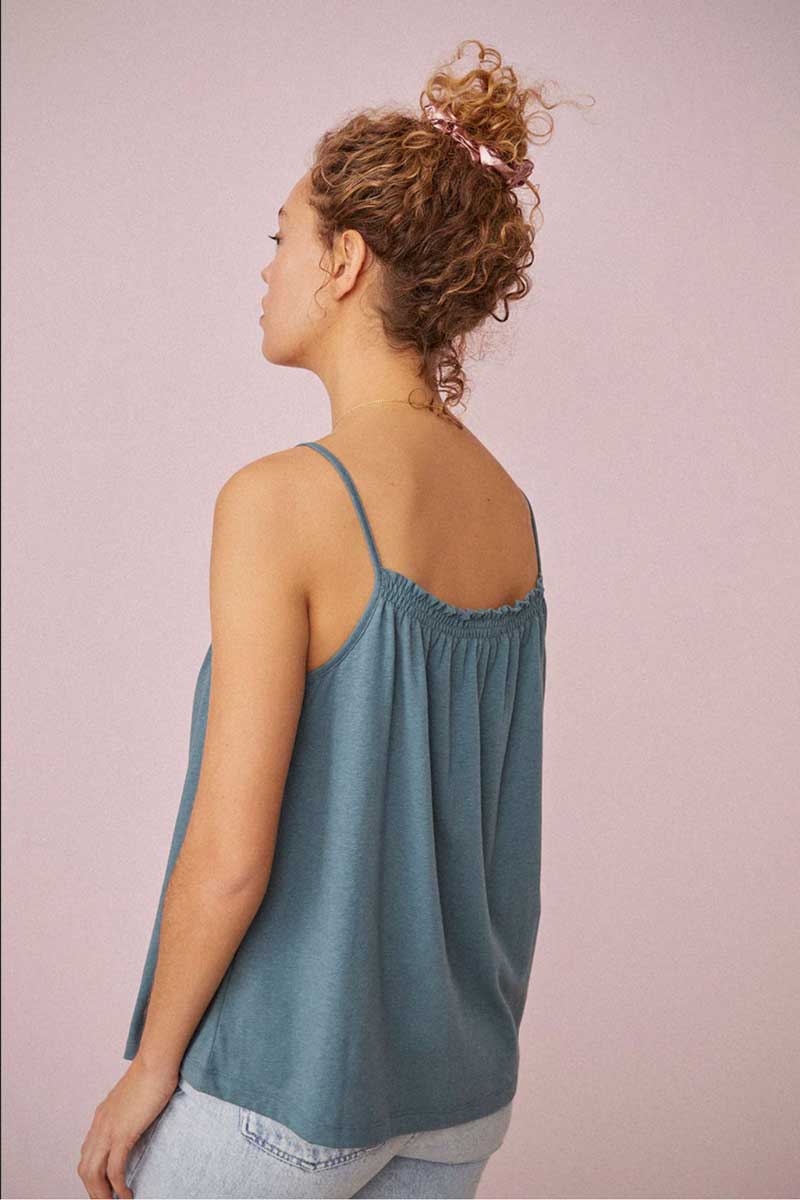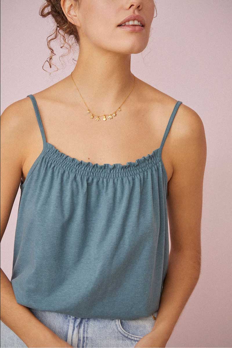 An Sommer Tagen begleitet Dich dieses Top mit schmalen Trägern durch die Sonne. Ergänzt mit gerafften Steppnähten, die Volumen und Originalität verleihen, ist es die perfekte ergänzung zu Deiner Sommer-Garderobe.