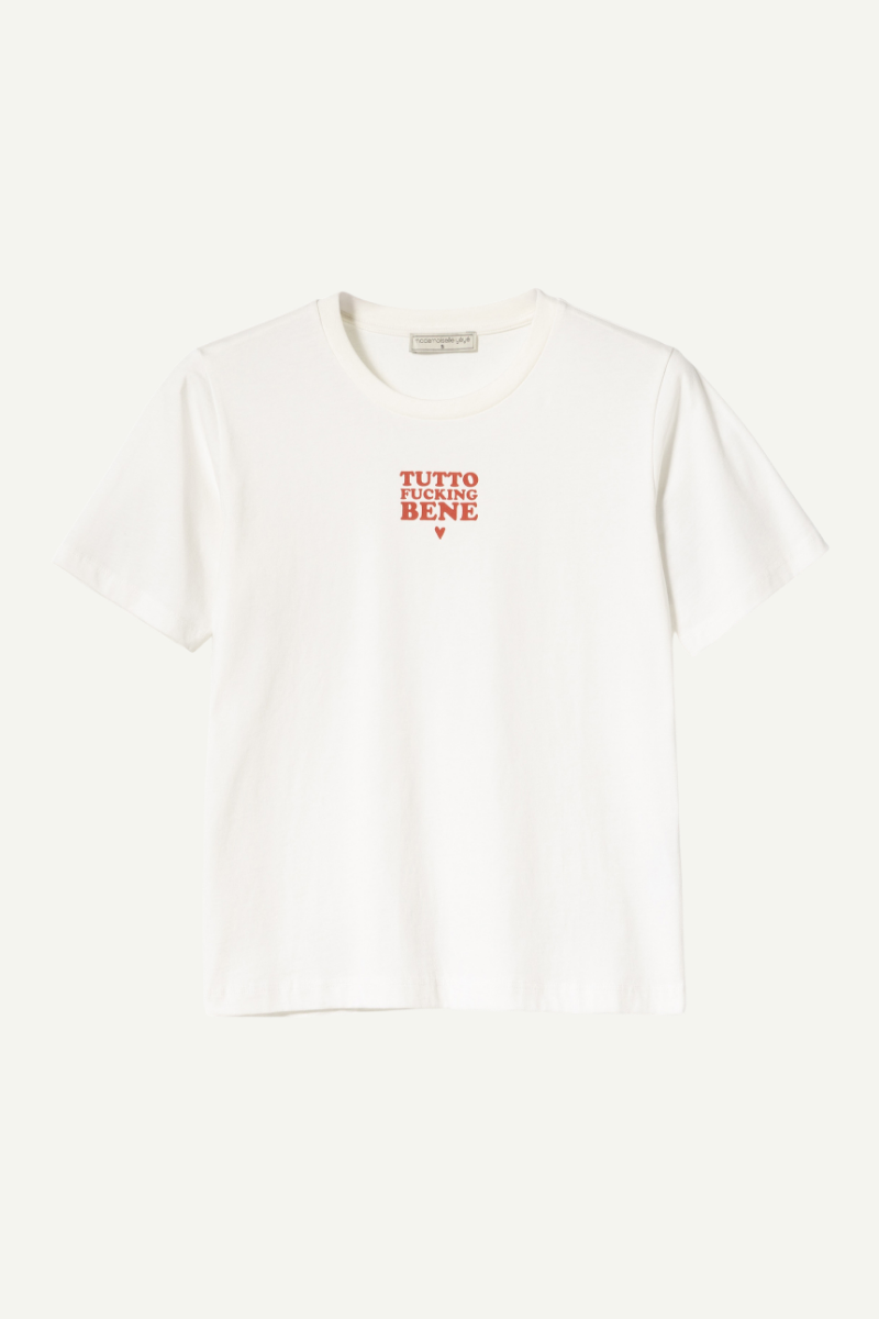Das T-Shirt "Tutto Bene" von Mademoiselle YéYé verbindet Nachhaltigkeit mit zeitlosem Stil. Aus zertifizierter, weicher Baumwolle gefertigt, bietet es dank leichtem Jersey-Material und lockerer Passform höchsten Tragekomfort. Der klassische Rundhalsausschnitt und die kurze Ärmel machen es vielseitig kombinierbar, während der markante Aufdruck vorne ein selbstbewusstes Statement setzt.
