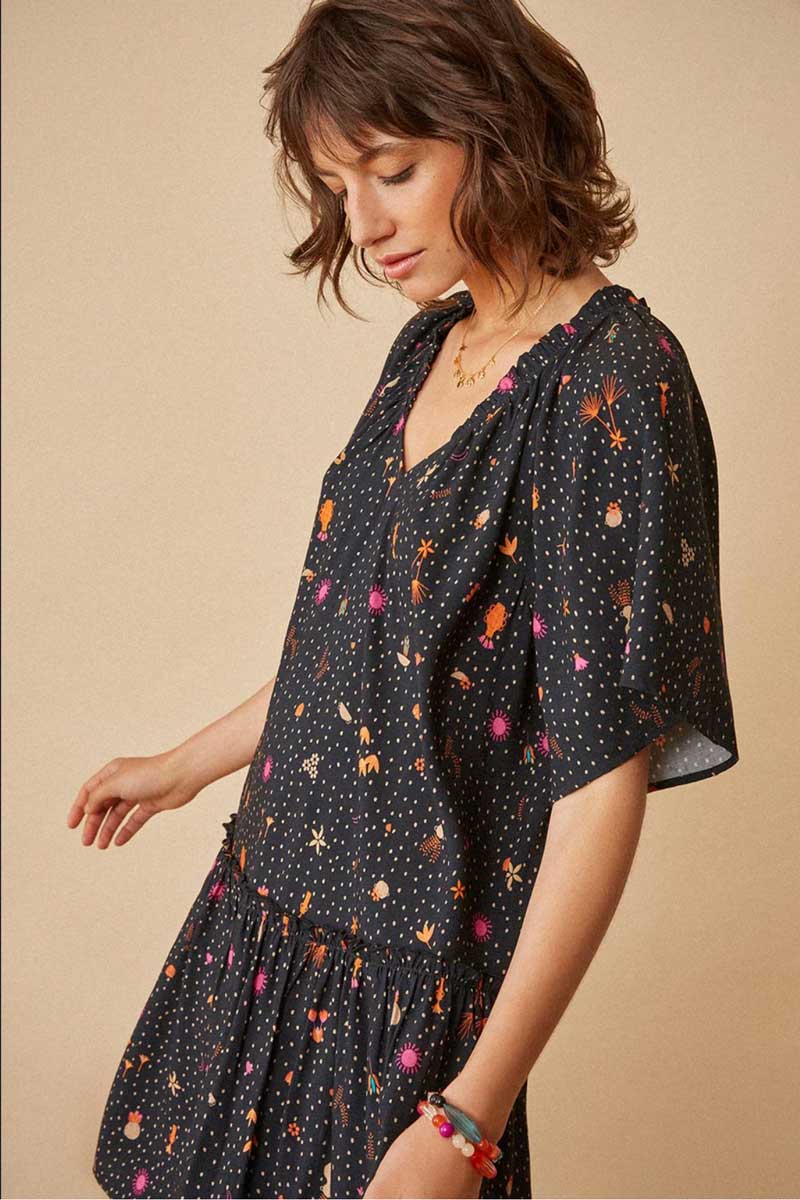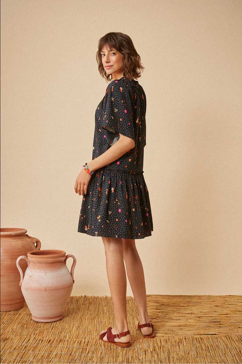 Schmetterlingsärmel, geraffter und ausgestellter Saum und minimalistischer Grafikdruck werten dieses Kleid auf. Weich und leicht zu tragen, ist es das perfekte Kleid für die Sommertage.