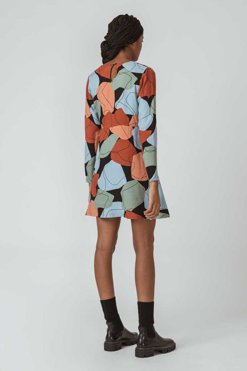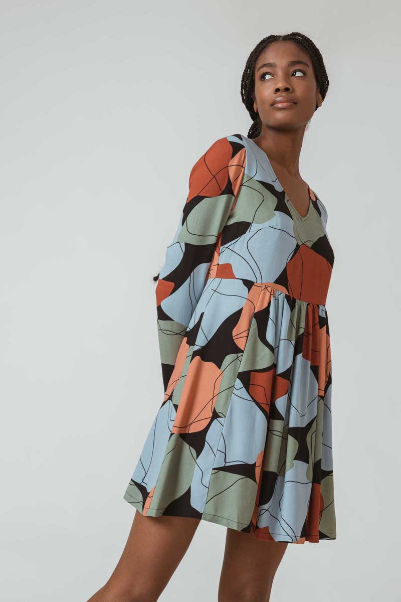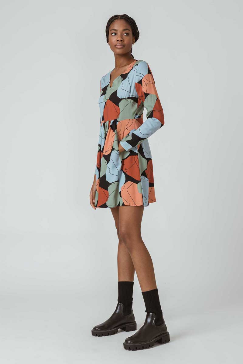Kurzes langarm Kleid aus 100% ECOVERO mit V-Ausschnitt und Vordertaschen.