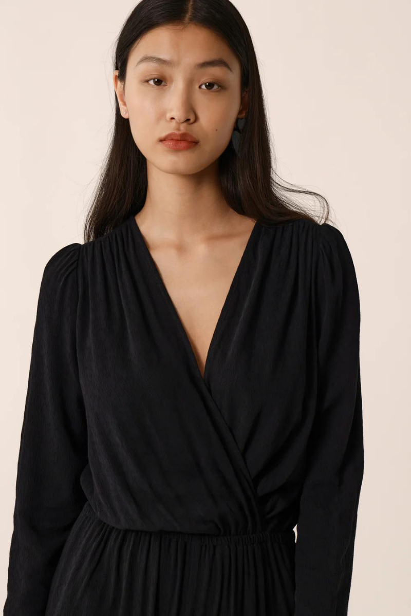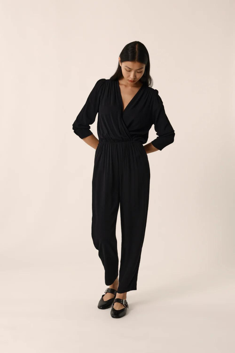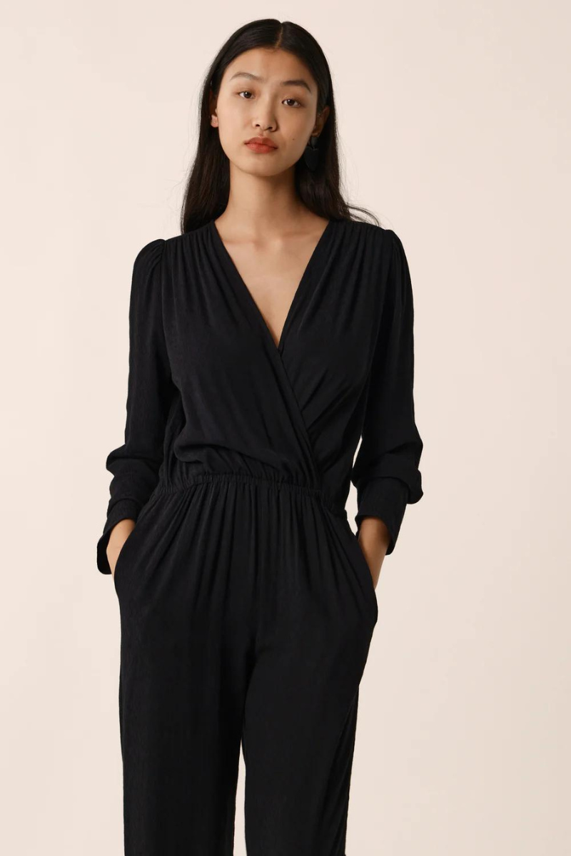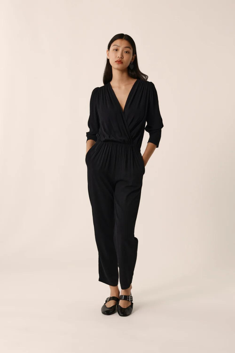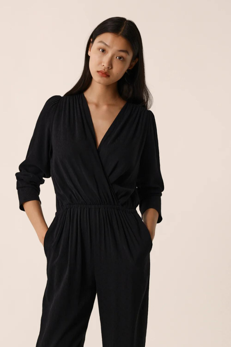 Dieser Jumpsuit von Des Petits Hauts bietet eine elegante Wahl für den Abend und besondere Tage. Der Wickelausschnitt, die Rüschen an den Schultern, der Taille und den Ärmeln sowie der elastische Bund verleihen eine schmeichelhafte Silhouette. Der schwarze Overall aus Viskose ist leicht zu pflegen und knittert kaum.