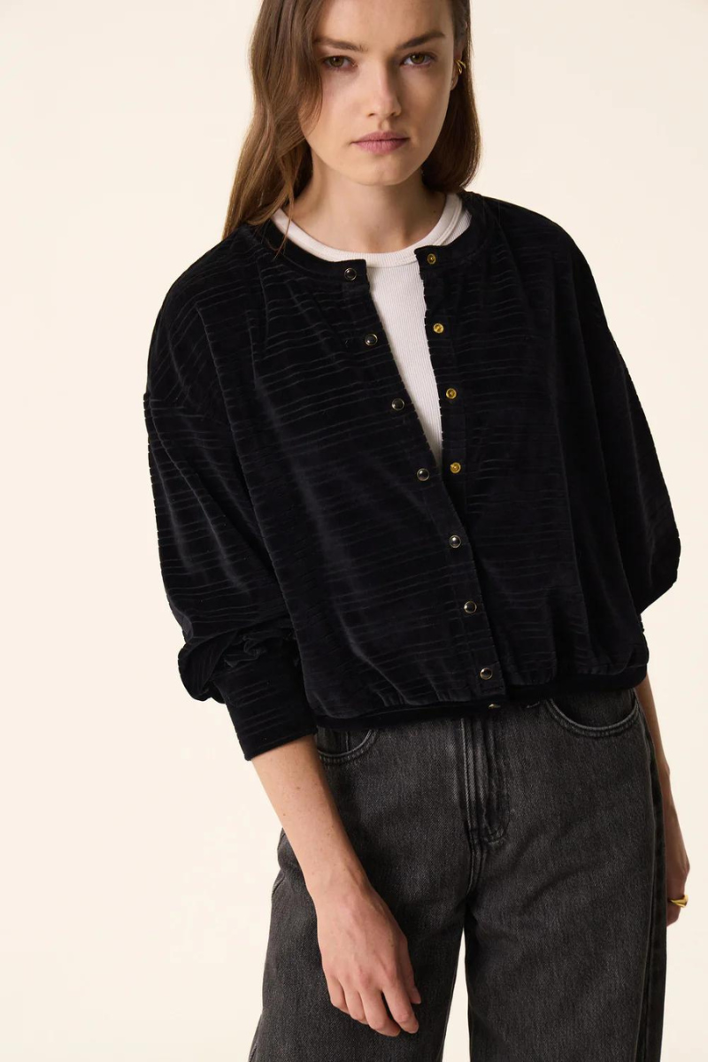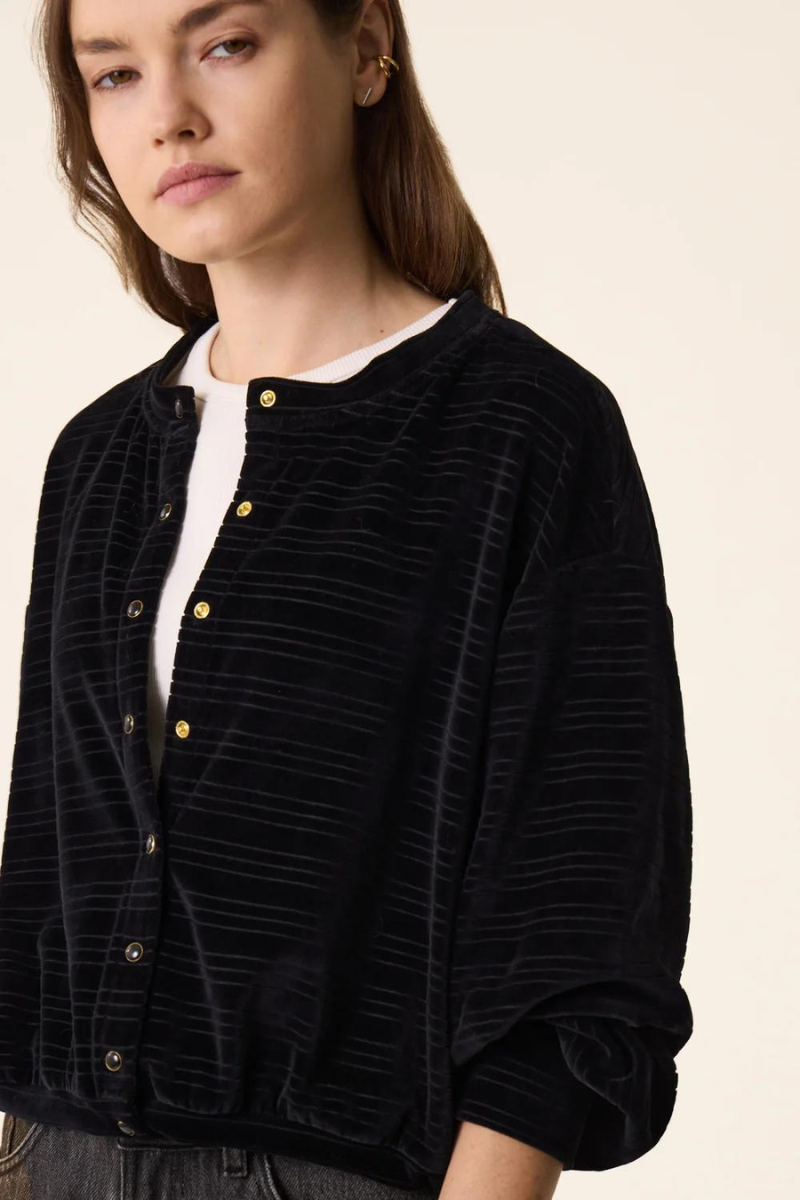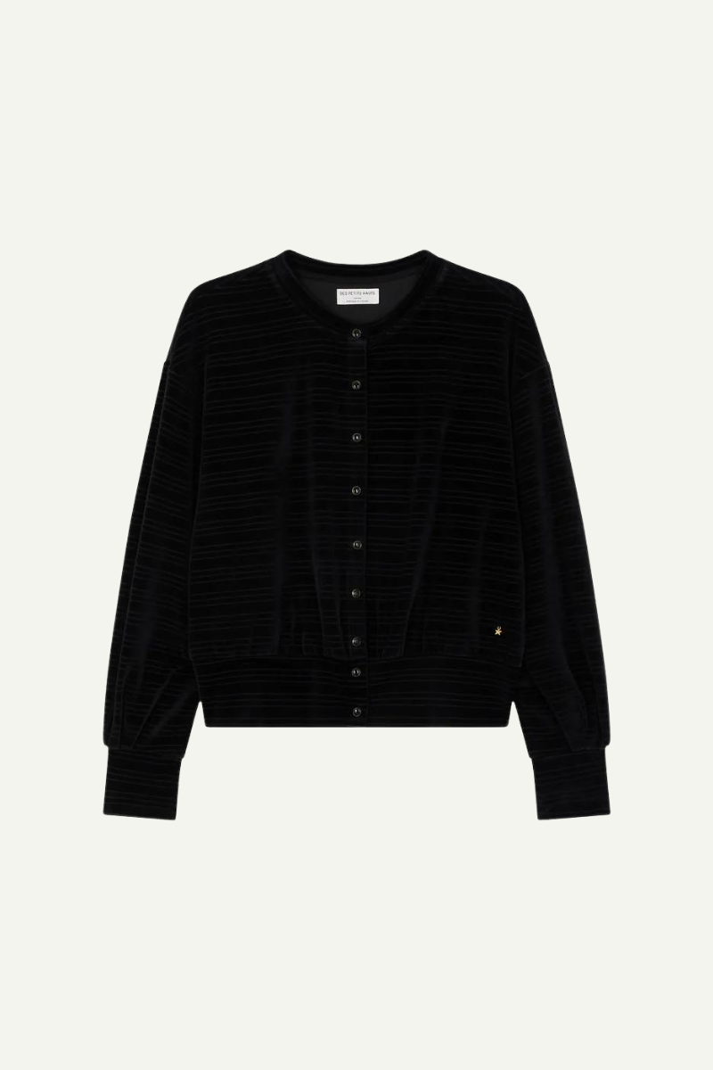 Mit dem Cardigan Zoraya von Des Petits Hauts setzt du ein elegantes Statement. Der Blouson-Stil mit Rundhalsausschnitt und leicht zulaufendem Saum verleiht einen preppy und schicken Look. Trage sie entweder als Komplett-Outfit mit passender Hose oder kombiniere sie mit einem Kleid für vielseitige Styling-Optionen. Aus weichem, glattem Samt gefertigt, in zeitlos elegantem Schwarz.