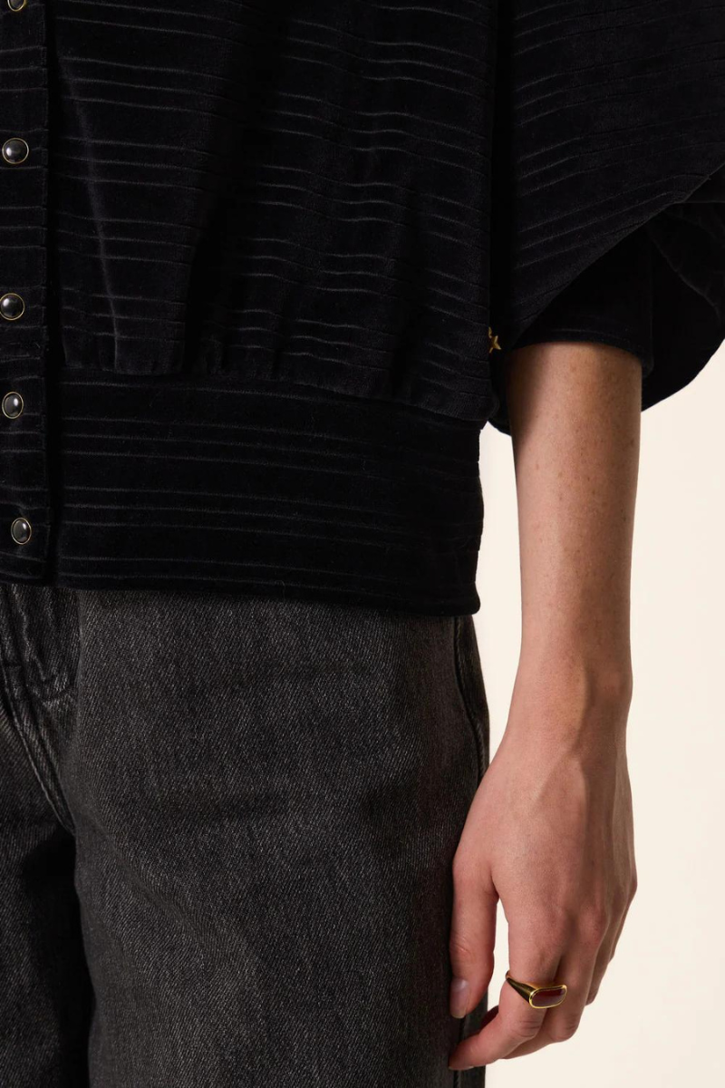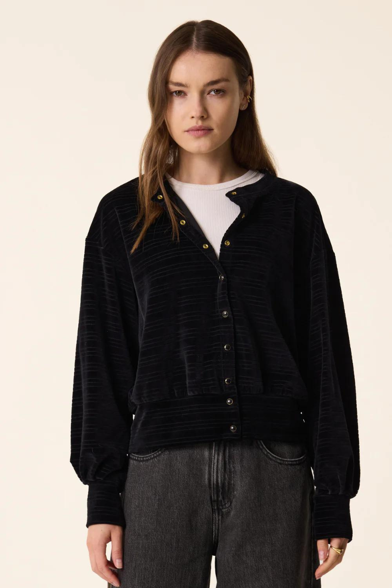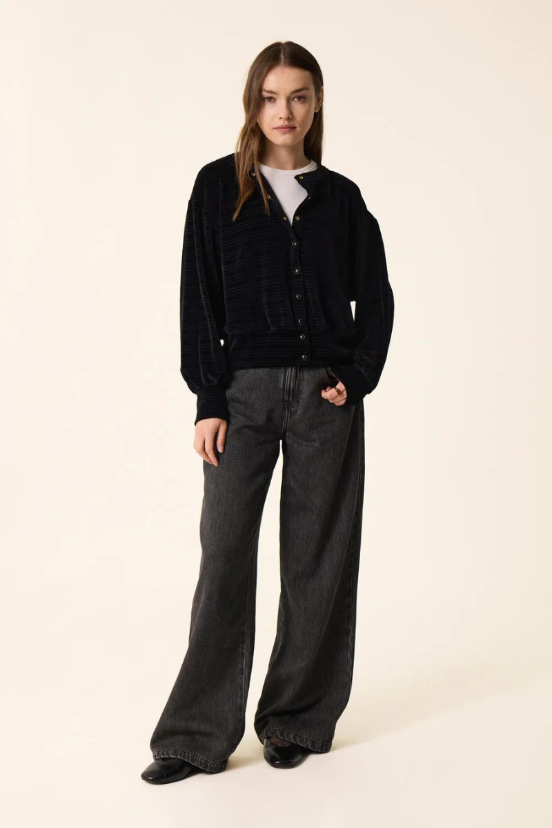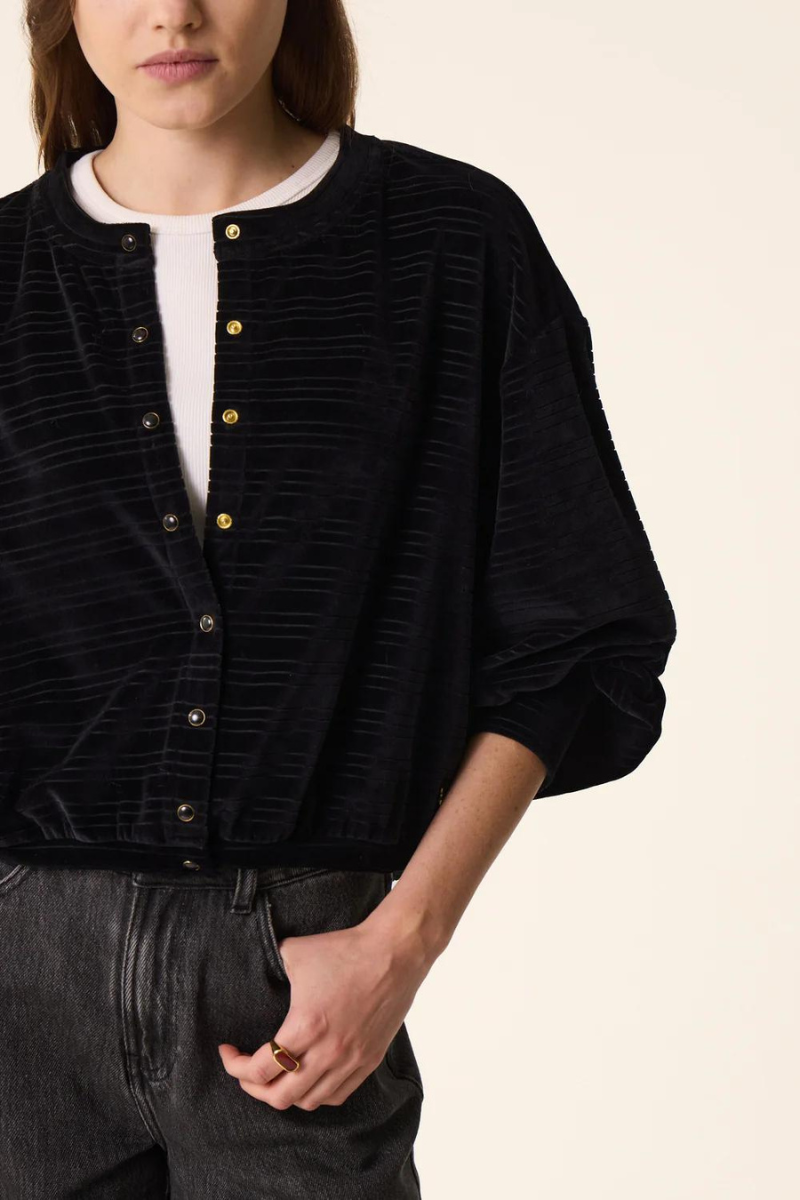 Mit dem Cardigan Zoraya von Des Petits Hauts setzt du ein elegantes Statement. Der Blouson-Stil mit Rundhalsausschnitt und leicht zulaufendem Saum verleiht einen preppy und schicken Look. Trage sie entweder als Komplett-Outfit mit passender Hose oder kombiniere sie mit einem Kleid für vielseitige Styling-Optionen. Aus weichem, glattem Samt gefertigt, in zeitlos elegantem Schwarz.