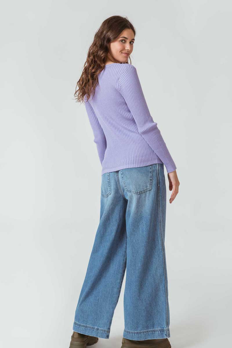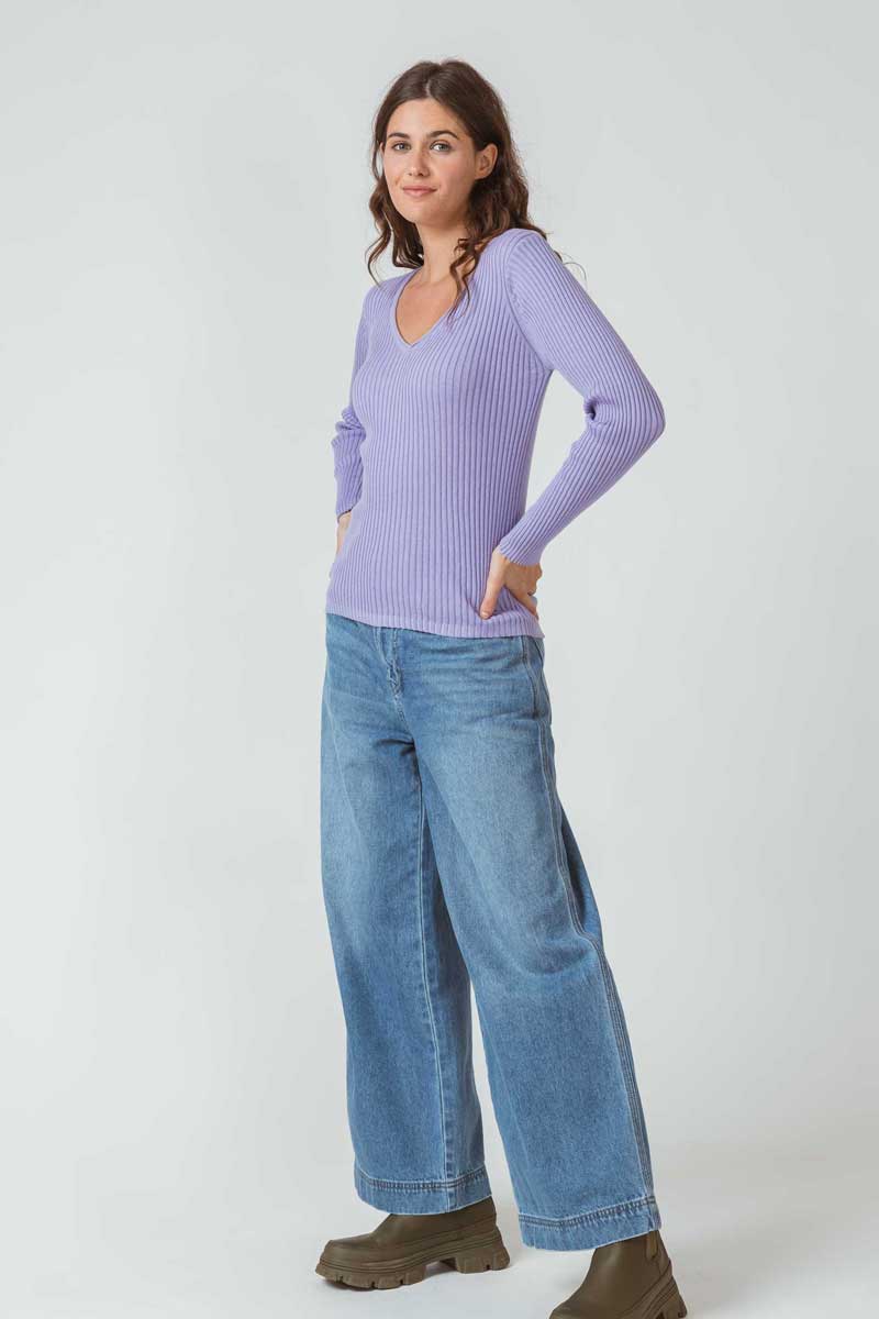 Langarm T-Shirt mit V-Ausschnitt aus fairtadezertifiziertem Bio-Baumwoll-Rippstrick.