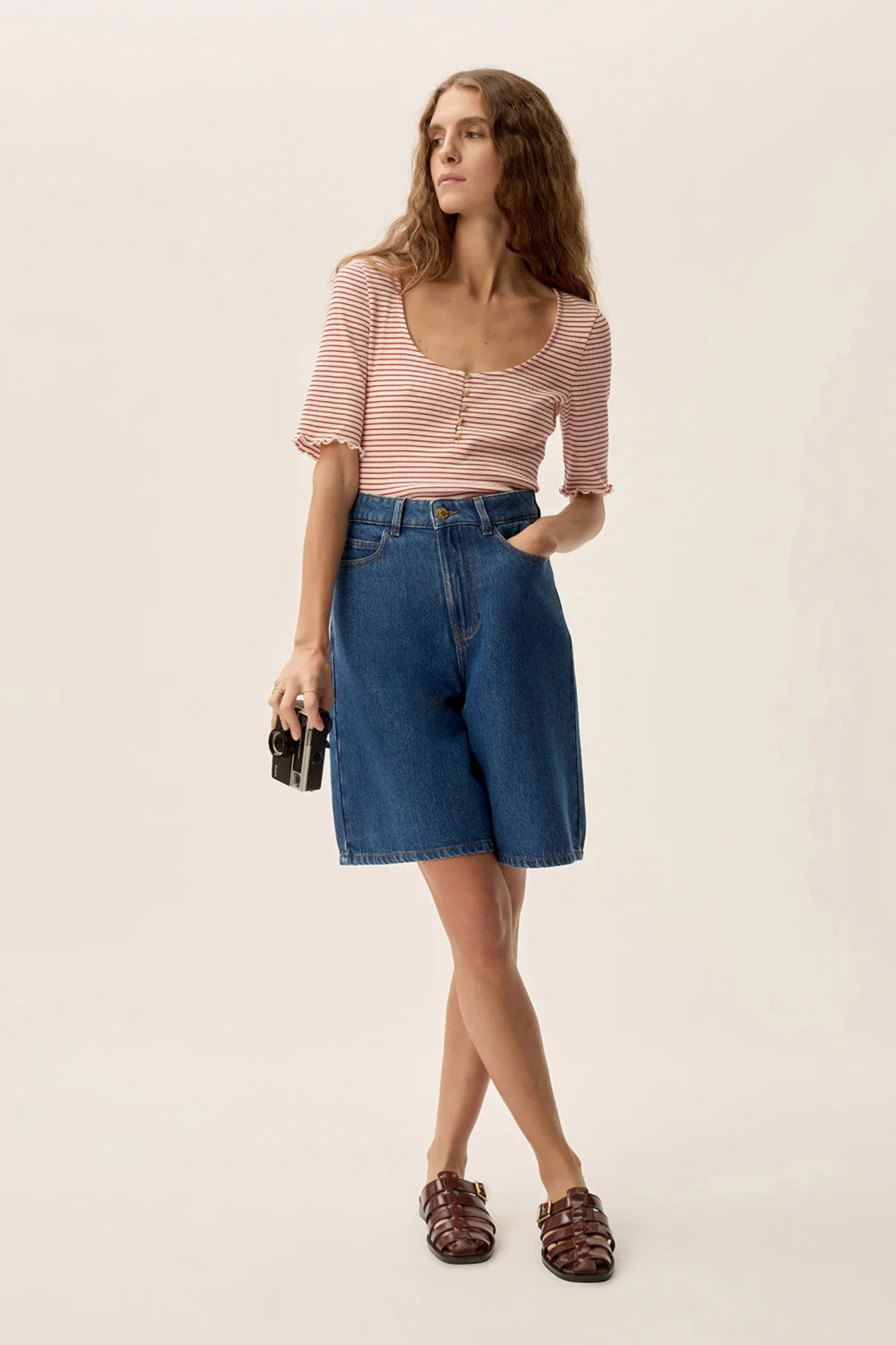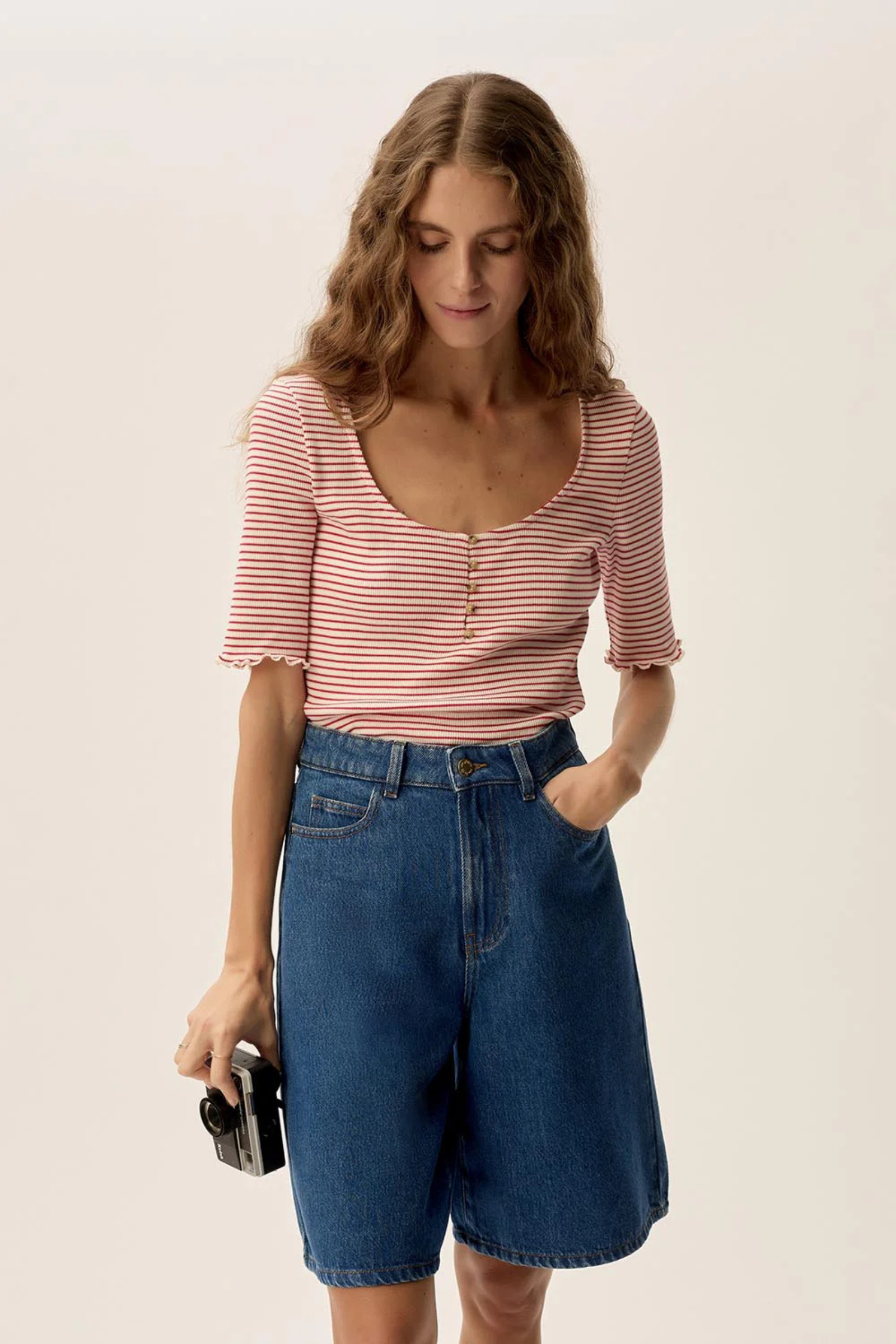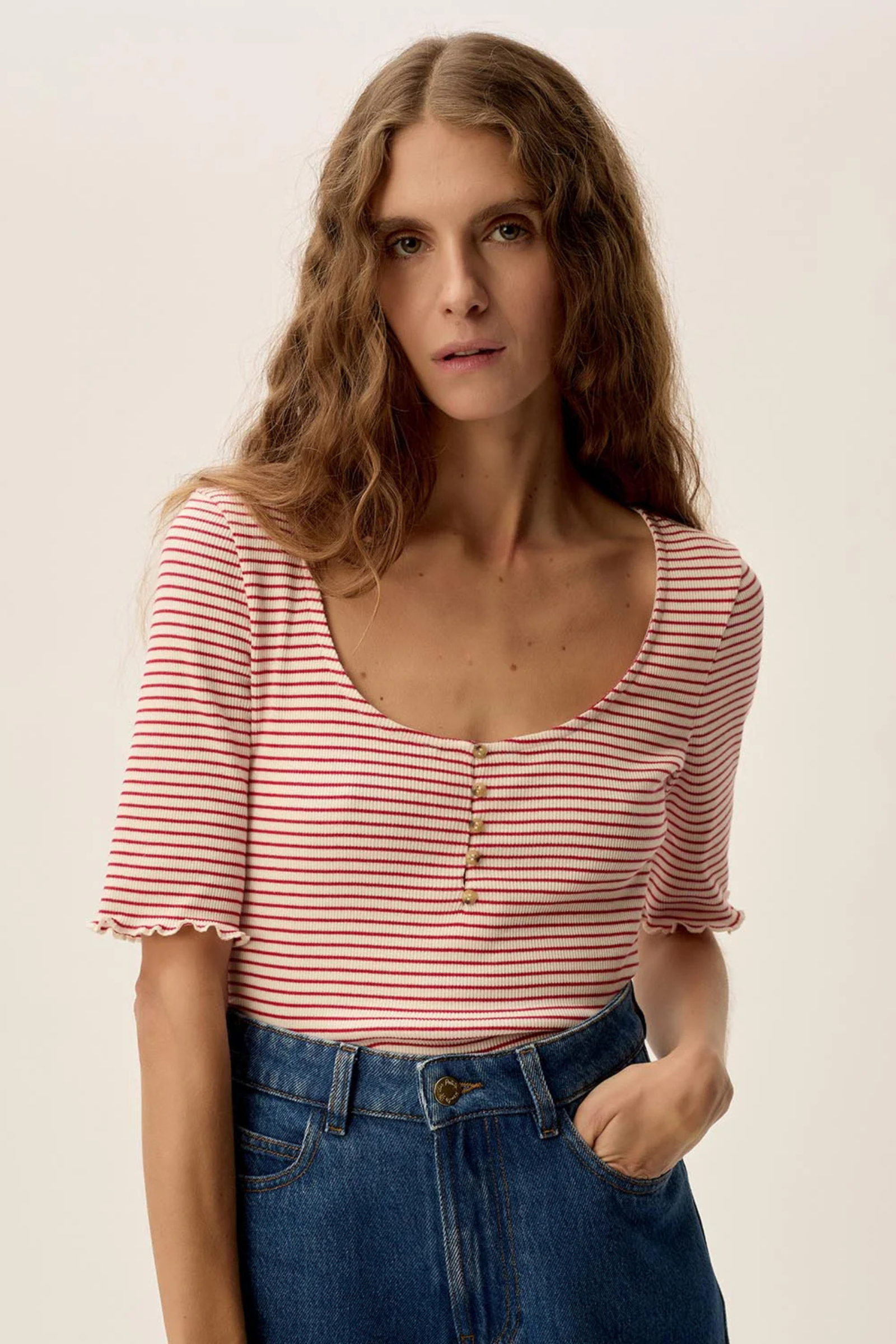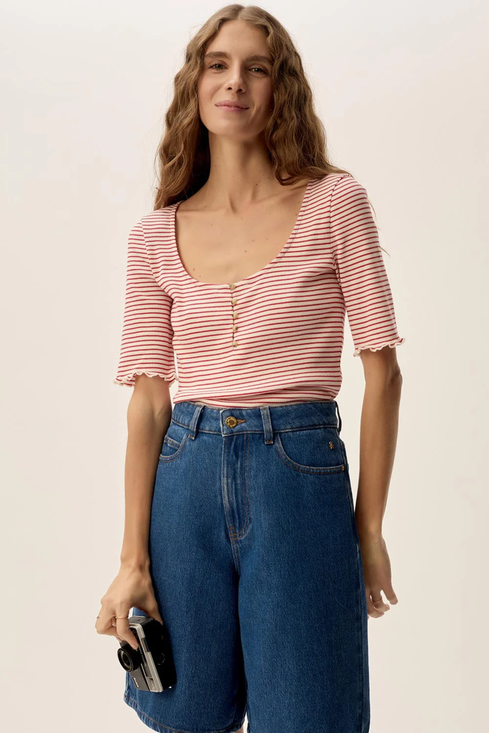 Dieses T-Shirt von Des Petits Hauts verbindet den grafischen Stil des ikonischen Mariniere-Looks mit dem Komfort einer gerippten Textur. Ein schmeichelnder Ausschnitt und feine Streifen verleihen dem T-Shirt Ines zusätzlichen Stil. Aus feinem Rippstrick mit enganliegender Passform, langen Ärmeln, Rundhalsausschnitt und knopfbaren Ausschnitt. Aus 100% Baumwolle, mit französischen Knöpfen und dekorativen Ziernähten an den Ärmeln und am Saum.