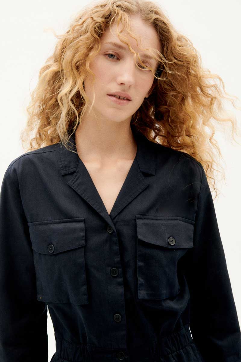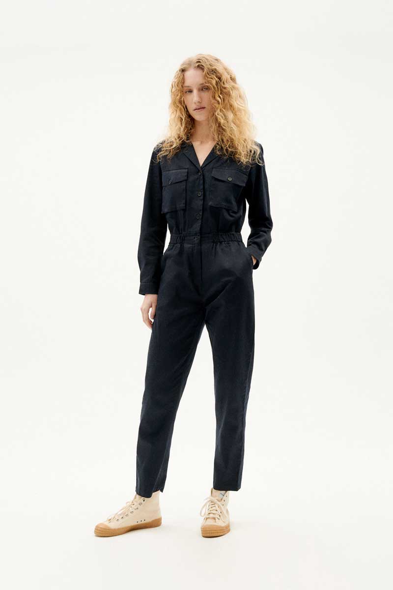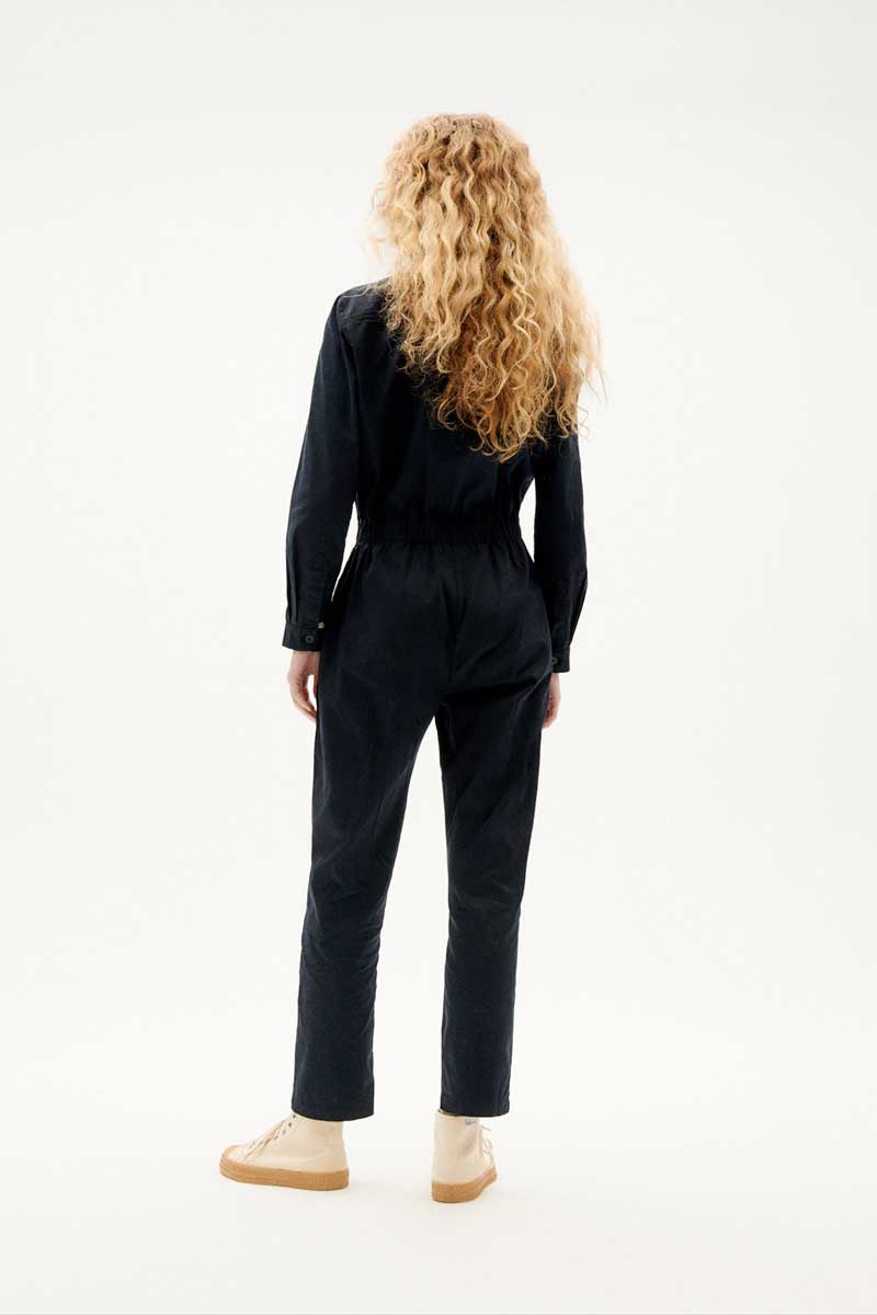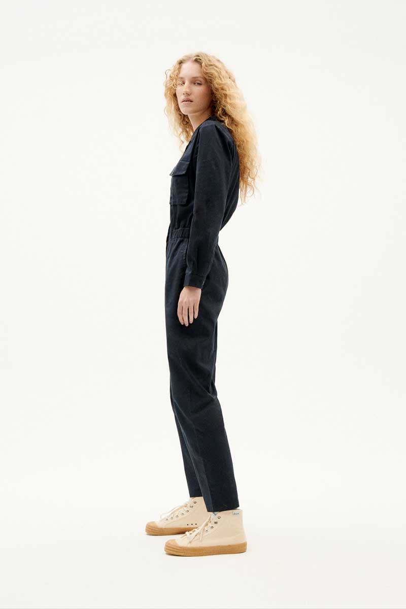Utility-Jumpsuit mit elastischem Bund, Vorder- und Gesäßtaschen, Frontreißverschluss und Corozo-Knopfverschluss. Hergestellt aus Bio Baumwolle.
