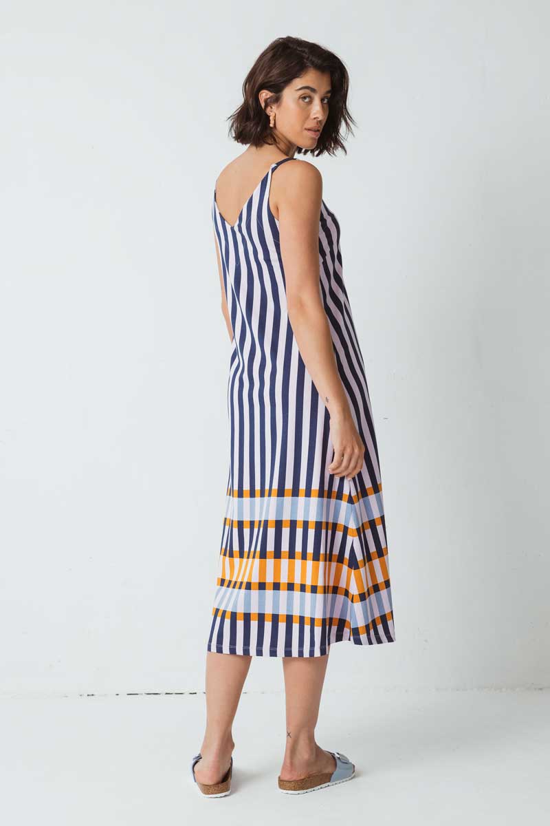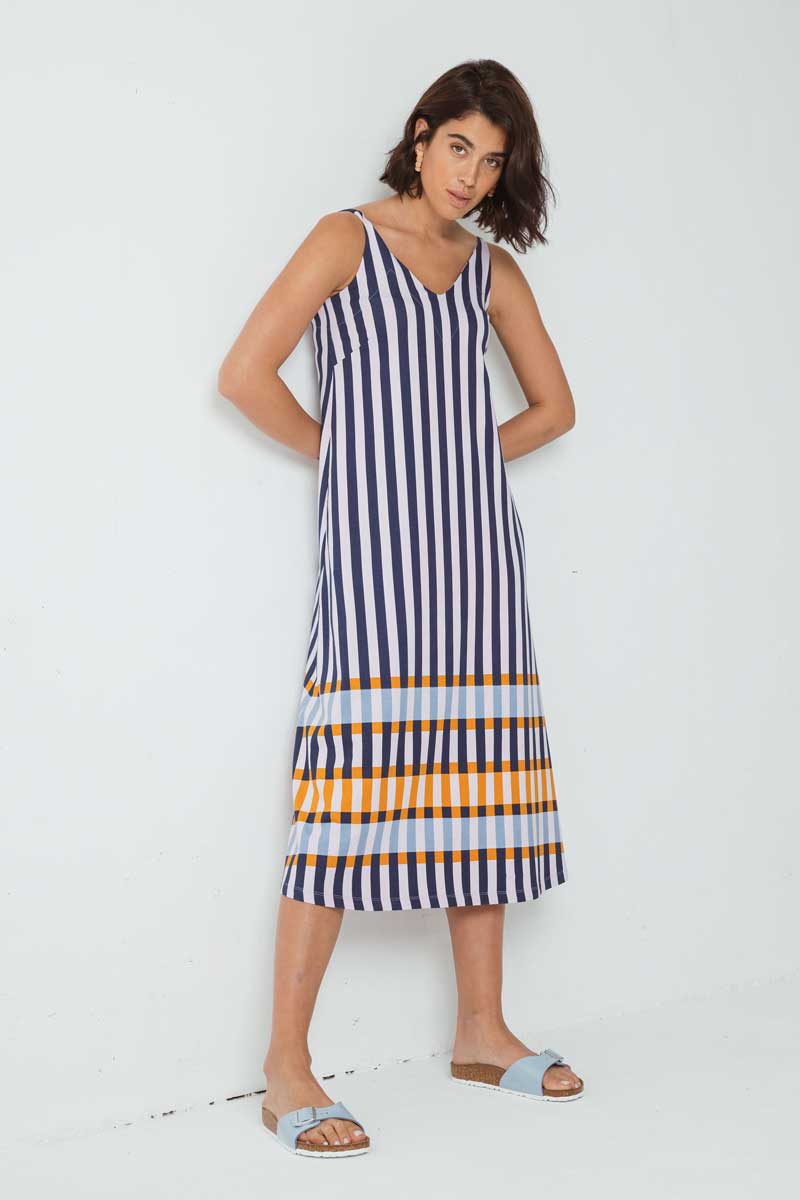 A-Linien-Kleid, Midikleid. V-Ausschnitt, ärmellos. Schulterstück in Kontrastfarbe. Gestreifter Druck in Strickware.