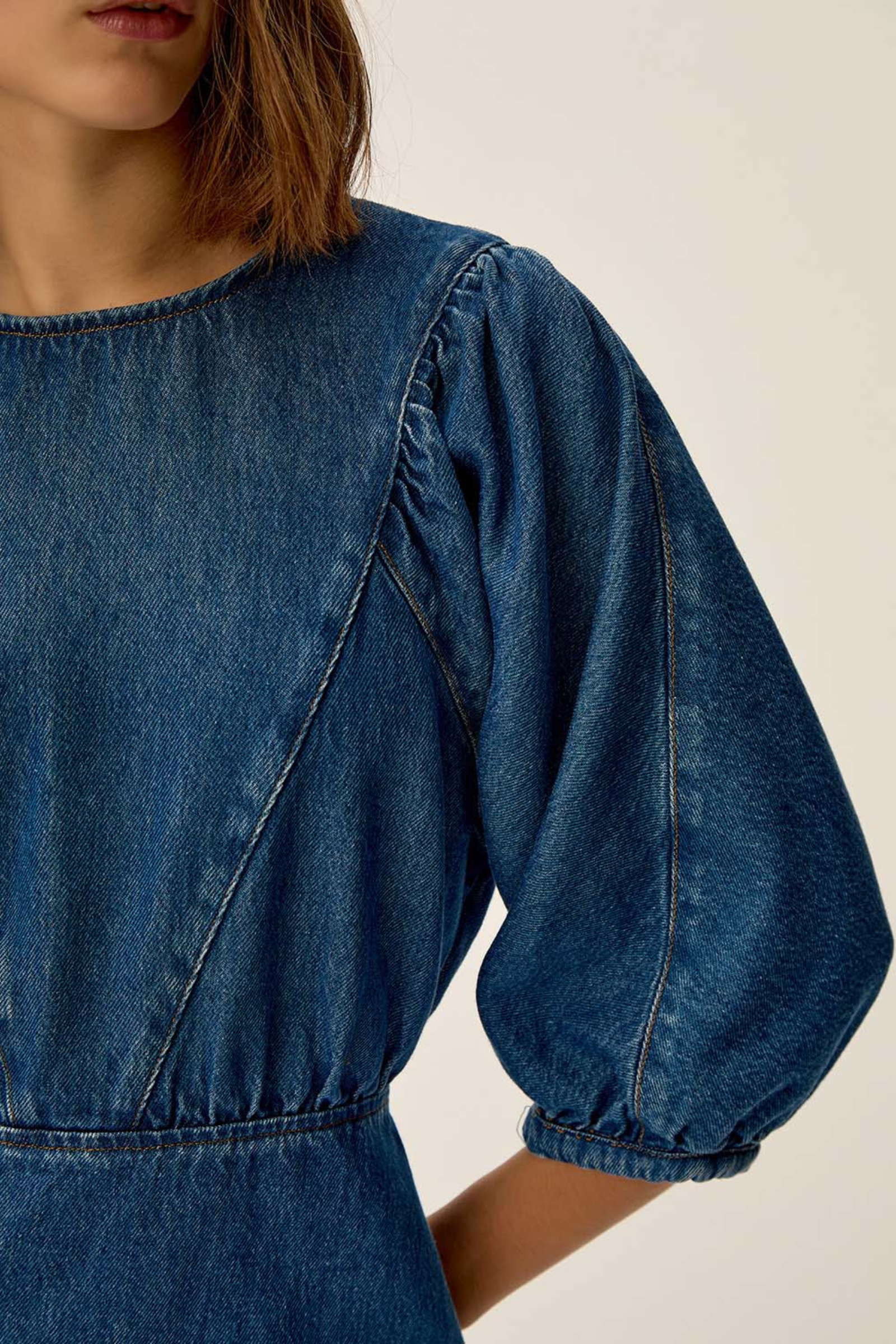 Das Kleid von Des Petits Hauts ist vielseitig einsetzbar und bietet sowohl Stil als auch Komfort. Die taillierte Passform, die Ballonärmel und die grafischen Einschnitte verleihen dieser kurzärmeligen Jeanskleid eine schmeichelhafte Länge.