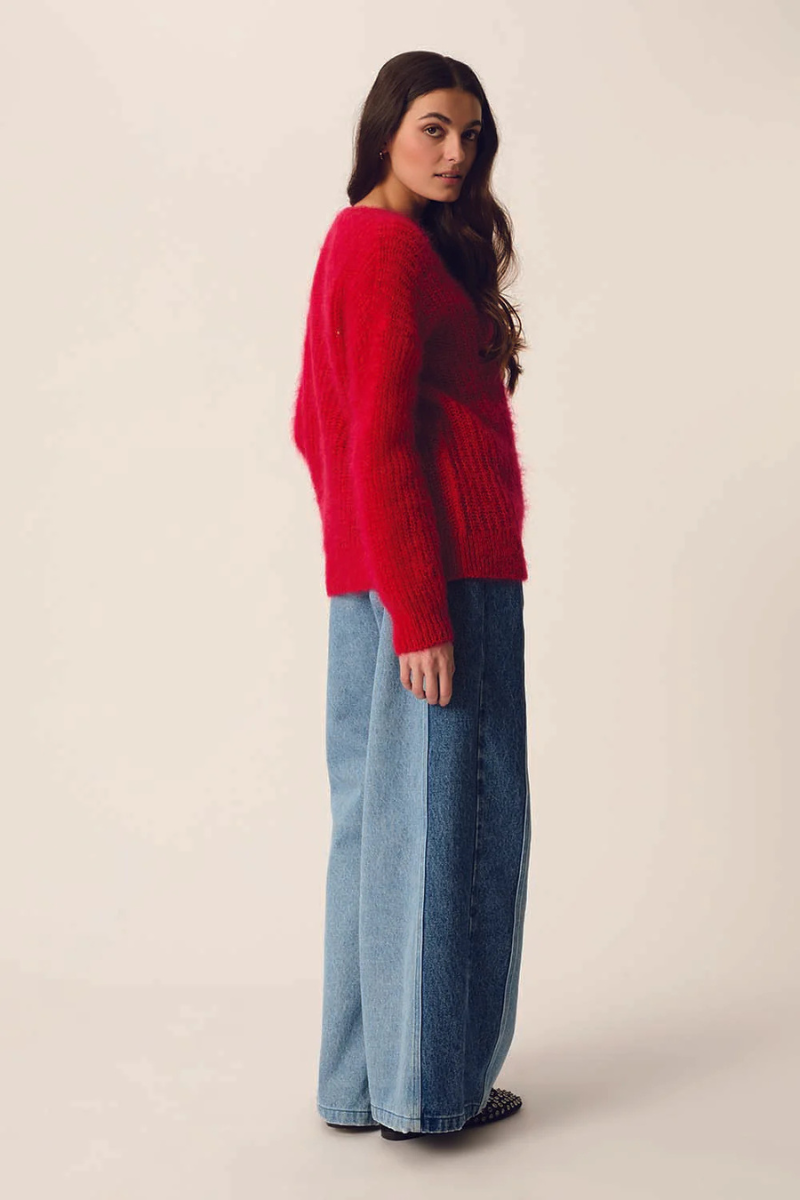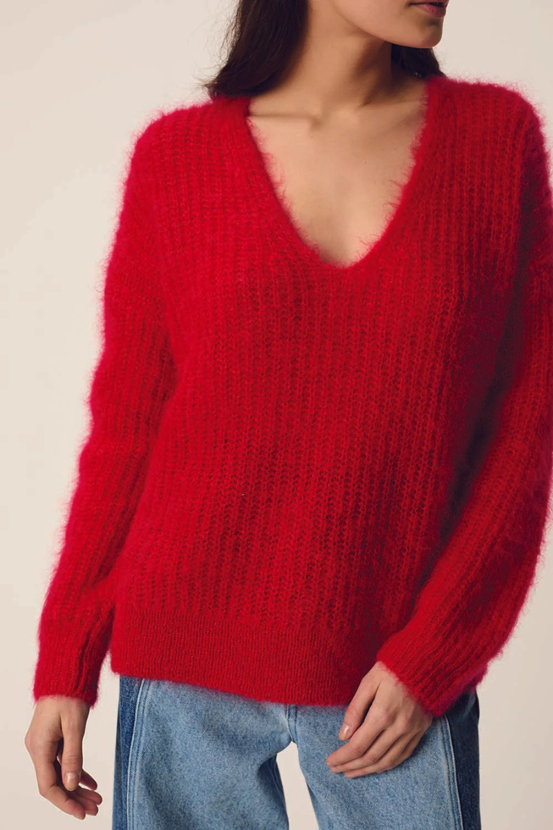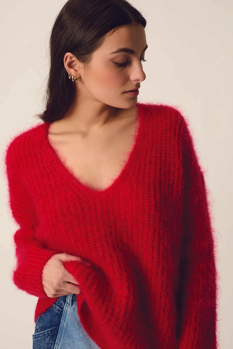 Der Pullover Charlie Carmin von Des Petits Hauts besticht durch seinen weiten Schnitt, die weiche, kuschelige Strickqualität und den eleganten V-Ausschnitt. Ein zeitloses Basic, welches von Saison zu Saison getragen werden kann.