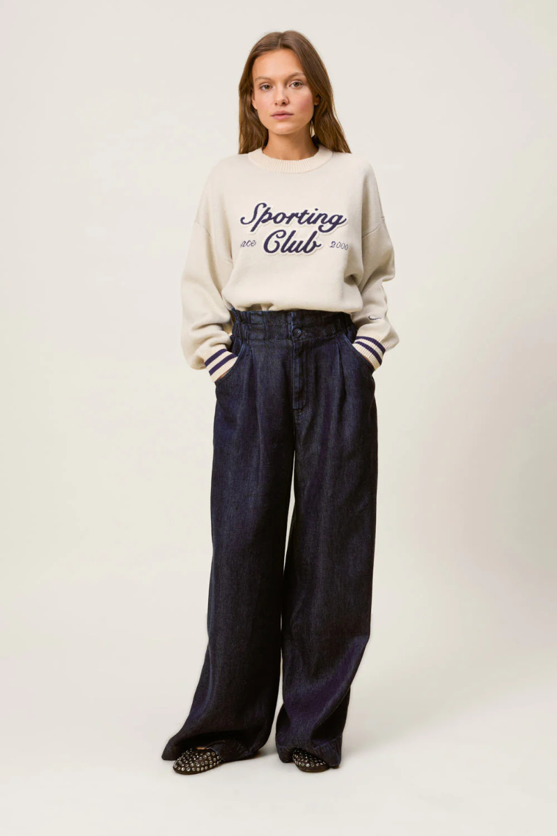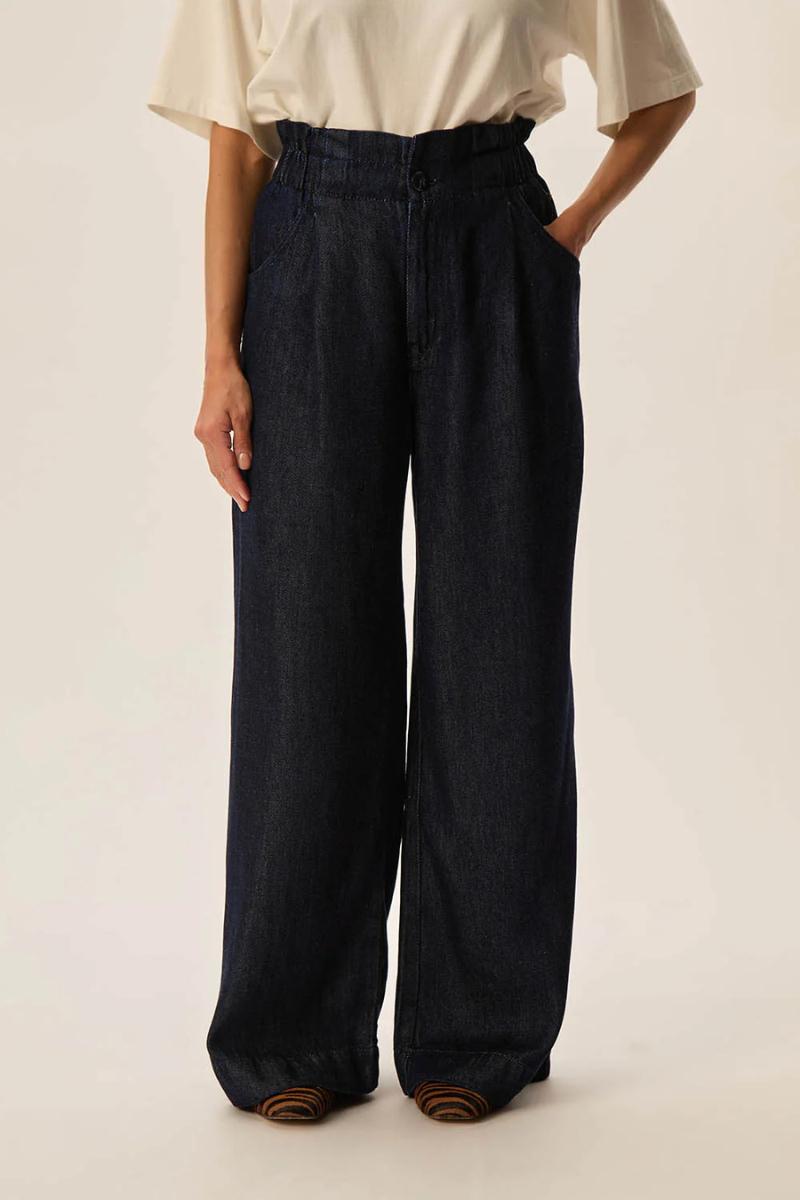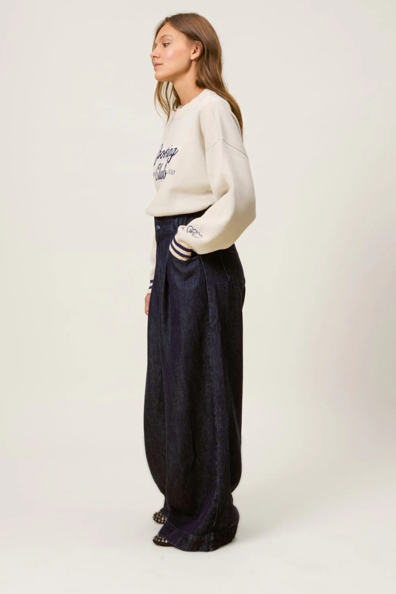 Der Jeans Loulou Deep Blue von Des Petits Hauts vereint Komfort und Stil mit seiner weiten Passform und dem hochgeschnittenen, gerafften Bund.