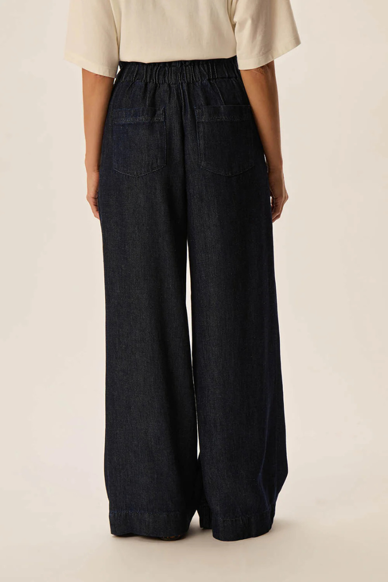Hergestellt aus 100 % Lyocell bietet dieser lange Denim-Hose ein fließendes, elegantes Tragegefühl. Die elastische Taille sorgt für perfekten Sitz, während der goldene Reißverschluss und der Knopf Akzente setzen. Praktische, abgerundete Taschen vorne und diamantförmige Taschen hinten runden das Design ab. Der tiefblaue Farbton verleiht Ihrem Look eine zeitlose, raffinierte Note – ideal für einen lässigen und zugleich schicken Auftritt.