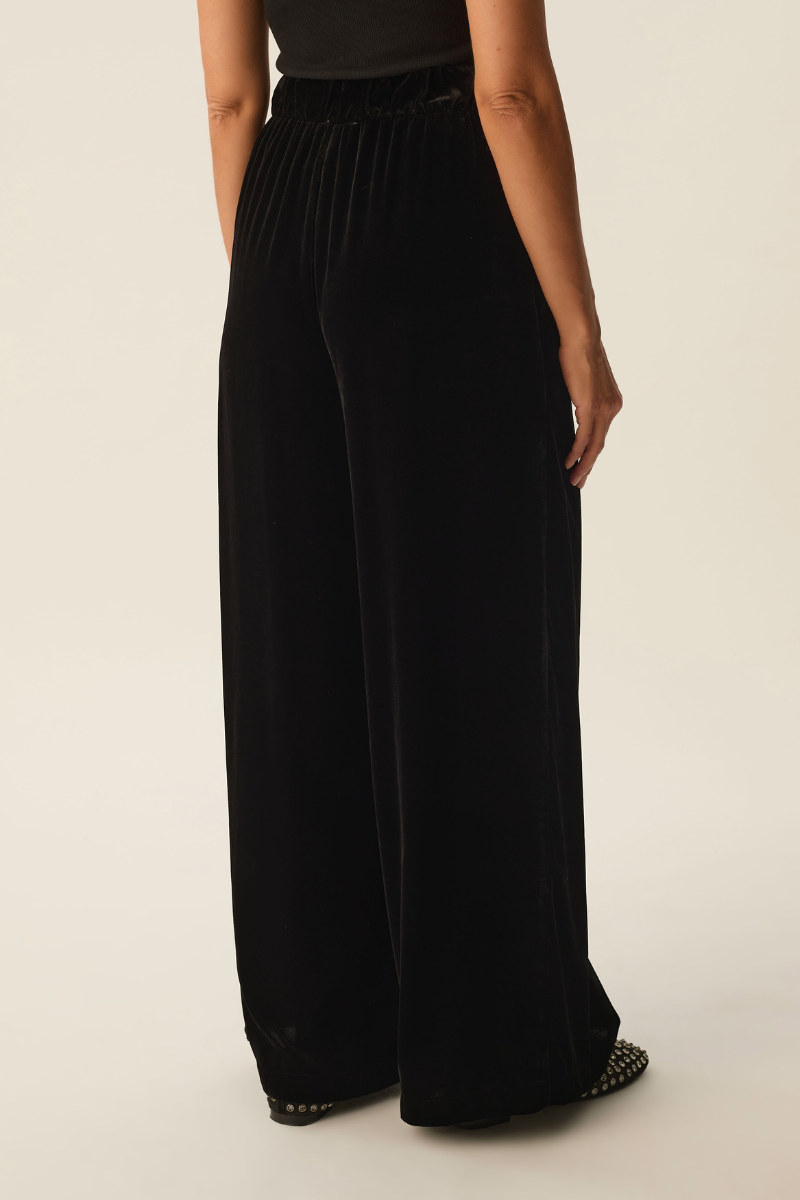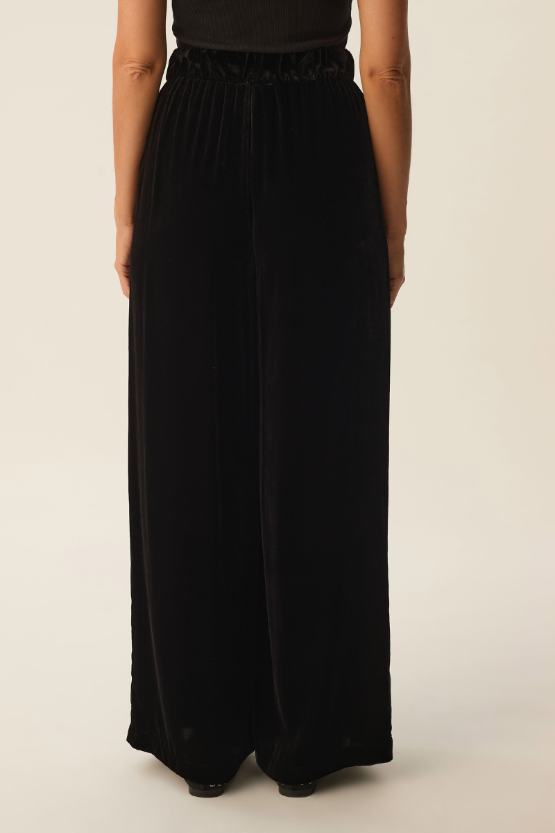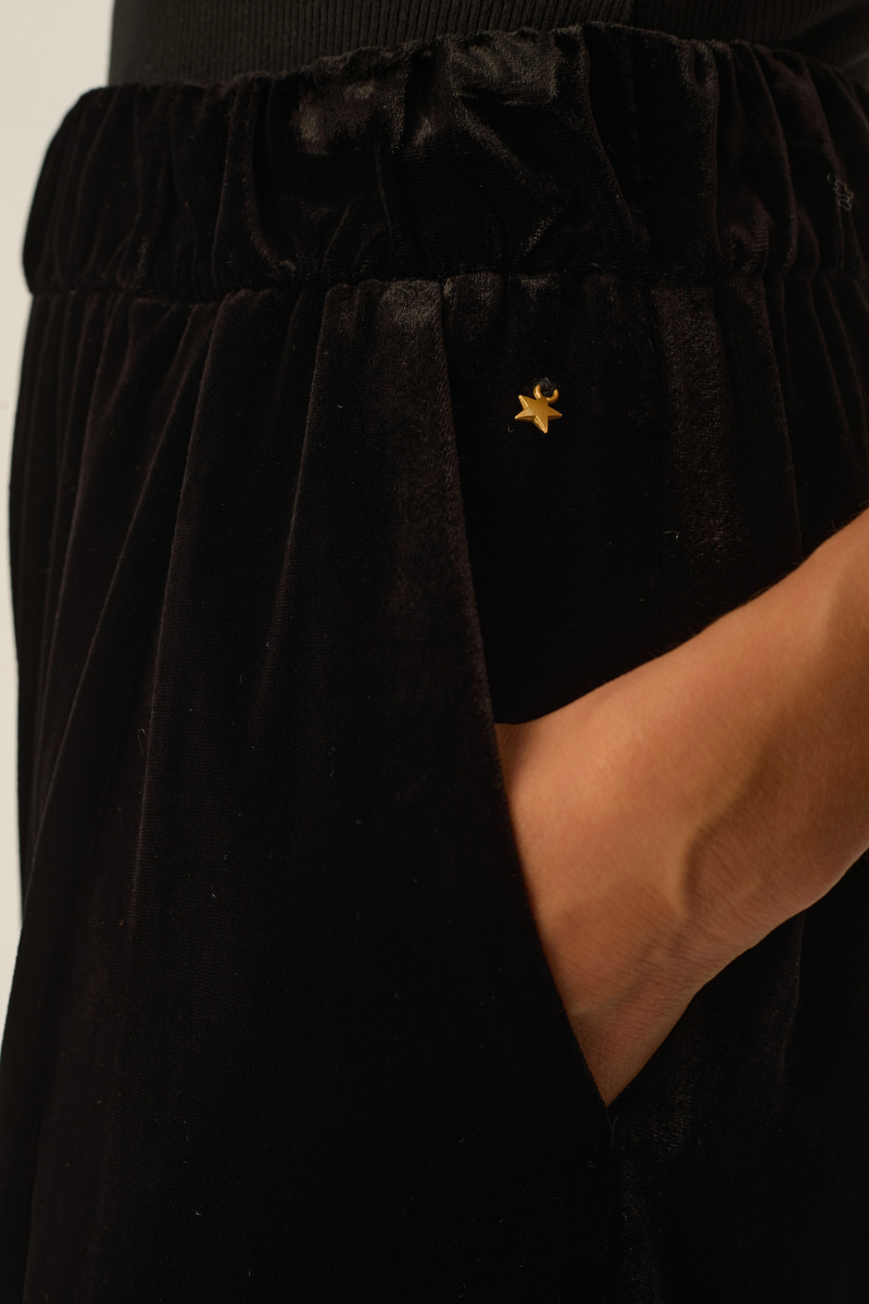 Diese Hose Iris Noir von Des Petits Hauts verbindet Komfort und Eleganz. Der weiche Samtstoff in Schwarz fühlt sich besonders angenehm auf der Haut an, während der elastische Bund für eine perfekte Passform sorgt. Mit langen, weiten Beinen und praktischen schrägen Seitentaschen ist sie ideal für Stilbewusste, die Bewegungsspielraum und eine edle Optik schätzen.