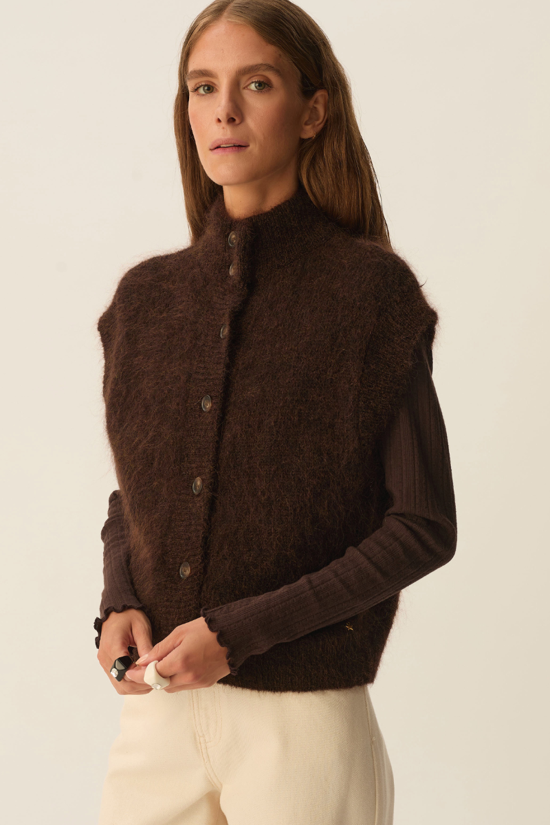 Diese Kurzarm-Strickjacke Alibou Coffee von DES PETITS HAUTS verbindet weichen Komfort mit zeitloser Eleganz. Das kaffeebraune Material aus Kid Mohair sorgt für angenehme Wärme und ein luxuriöses Tragegefühl. Die Knopfleiste vorne ermöglicht ein offenes und geschlossenes Tragen und verleiht dem Strickgilet einen klassischen Look – ideal für kühle Tage und vielseitige Outfits.