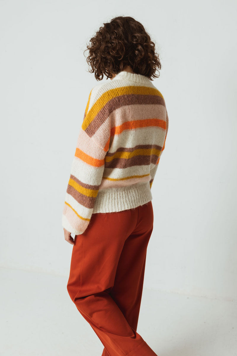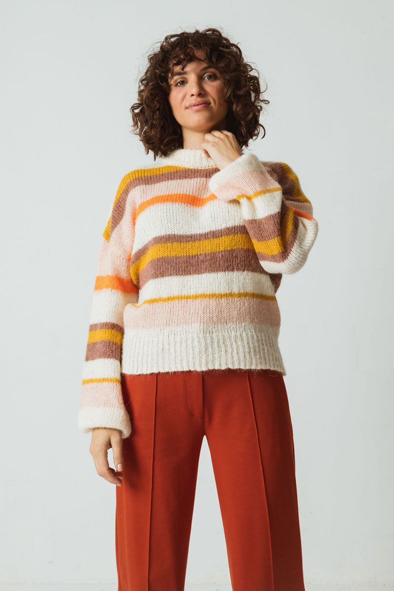 Dieser flauschige Strickpullover aus einem Mischgewebe aus feinster Alpaka-Wolle und rezykliertem Polyamid, fühlt sich wunderbar an. Das Multicolor Streifenmuster mach ihn zu einem echten Klassiker. Zusätzlich sorgt das haarige finish für extra Weichheit. Mit lockeren Ballonärmeln und anliegenden, schliessenden Säumchen beim Rundhals-Ausschnitt und an den Ärmelenden. Der untere Saum ist besonders breit für eine taillierte Form. Du wirst diesen warmen, kuscheligen Pullover lieben!