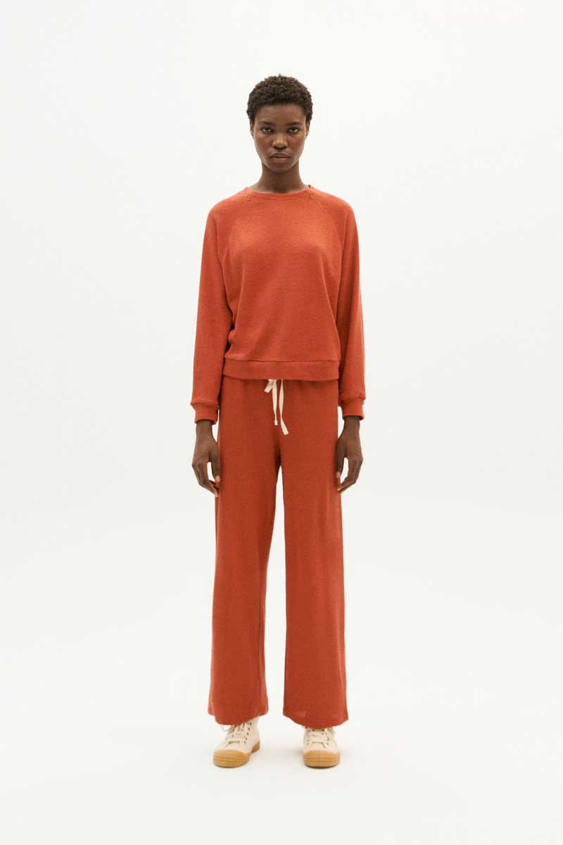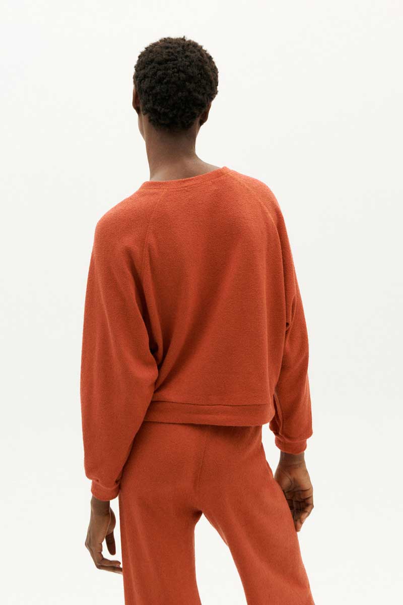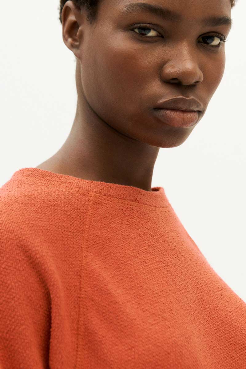 Strukturierter, bequemer Pullover in einem erdigen Orange, hergestellt aus einer Mischung aus recyceltem Polyester und recycelter Baumwolle. Perfekt für die gemütlichen Tage.