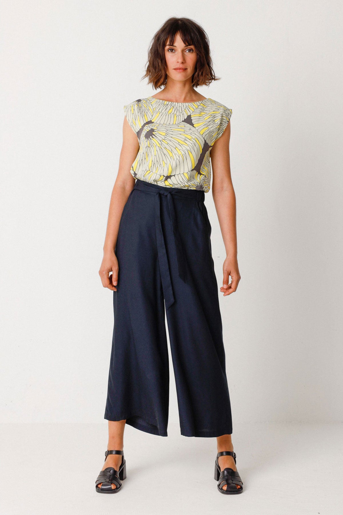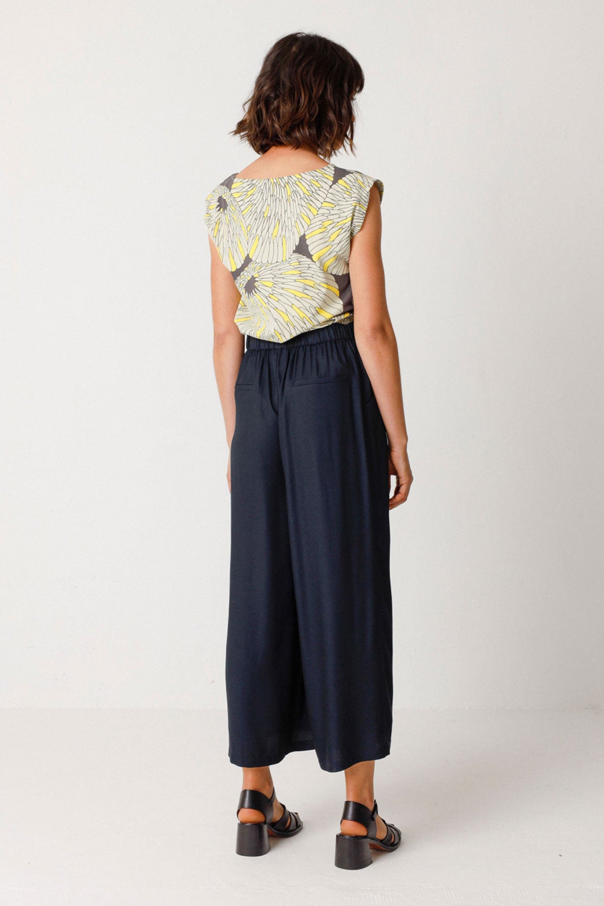 Bequeme Palazzo-Hose mit elastischer Taille, die dank eines Bindegürtels reguliert werden kann, sowie praktischen Vordertaschen. Schwarz.