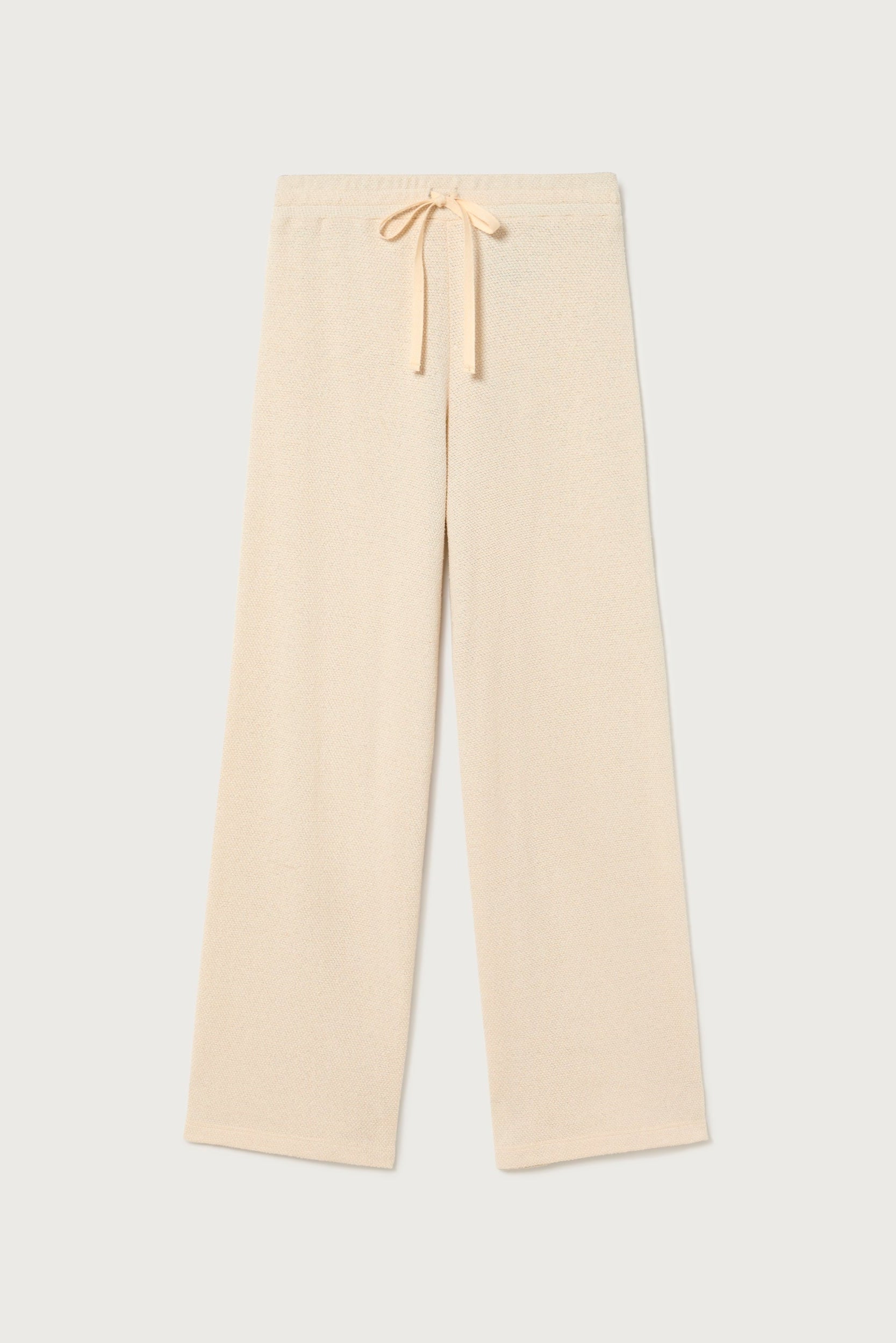 Texturierte, bequeme Hose in Weiss mit elastischem Bund. Hergestellt aus einer Mischung aus recyceltem, nicht verbrauchtem Polyester und recycelter, nicht verbrauchter Baumwolle. Perfekt für die gemütlichsten Tage.