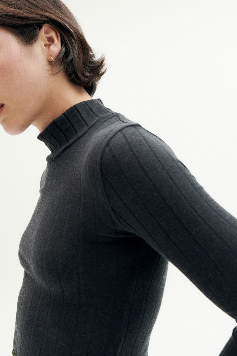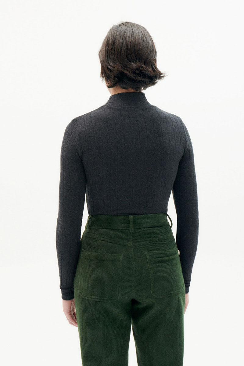 Tailliertes Oberteil mit hohem Kragen und langen Ärmeln. Hergestellt aus gerippter Wolle und recycelten Materialien.