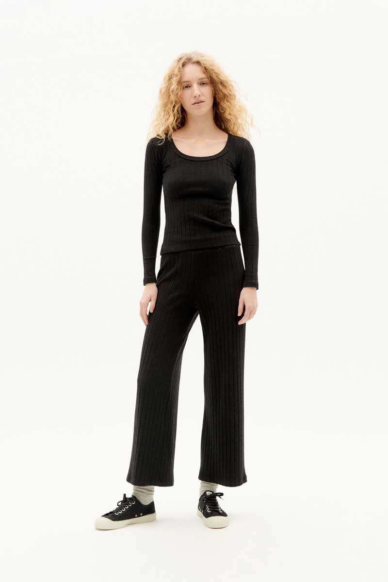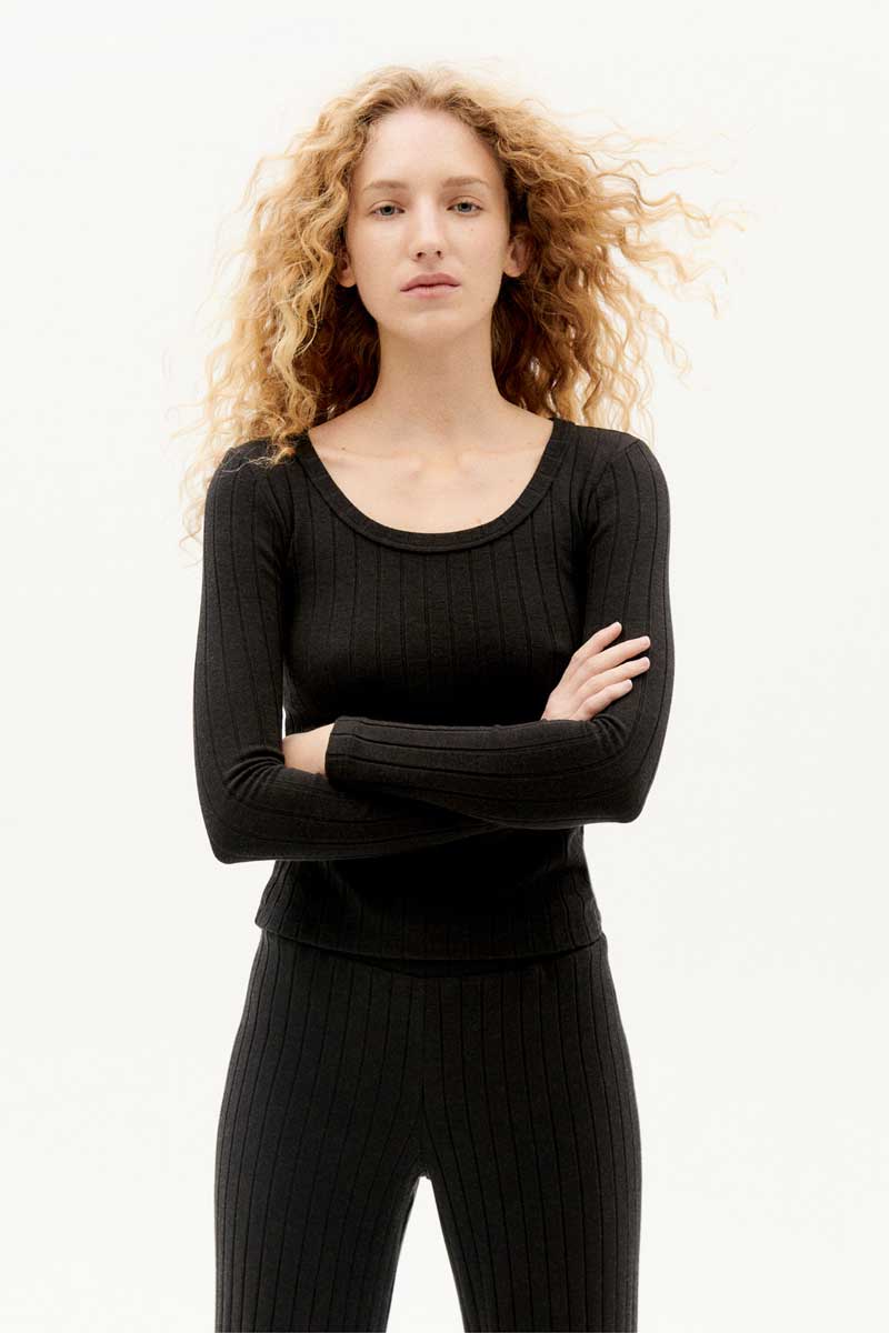 Tailliertes Rundhals-T-Shirt mit langen Ärmeln. Hergestellt aus gerippter Wolle und recycelten Materialien.