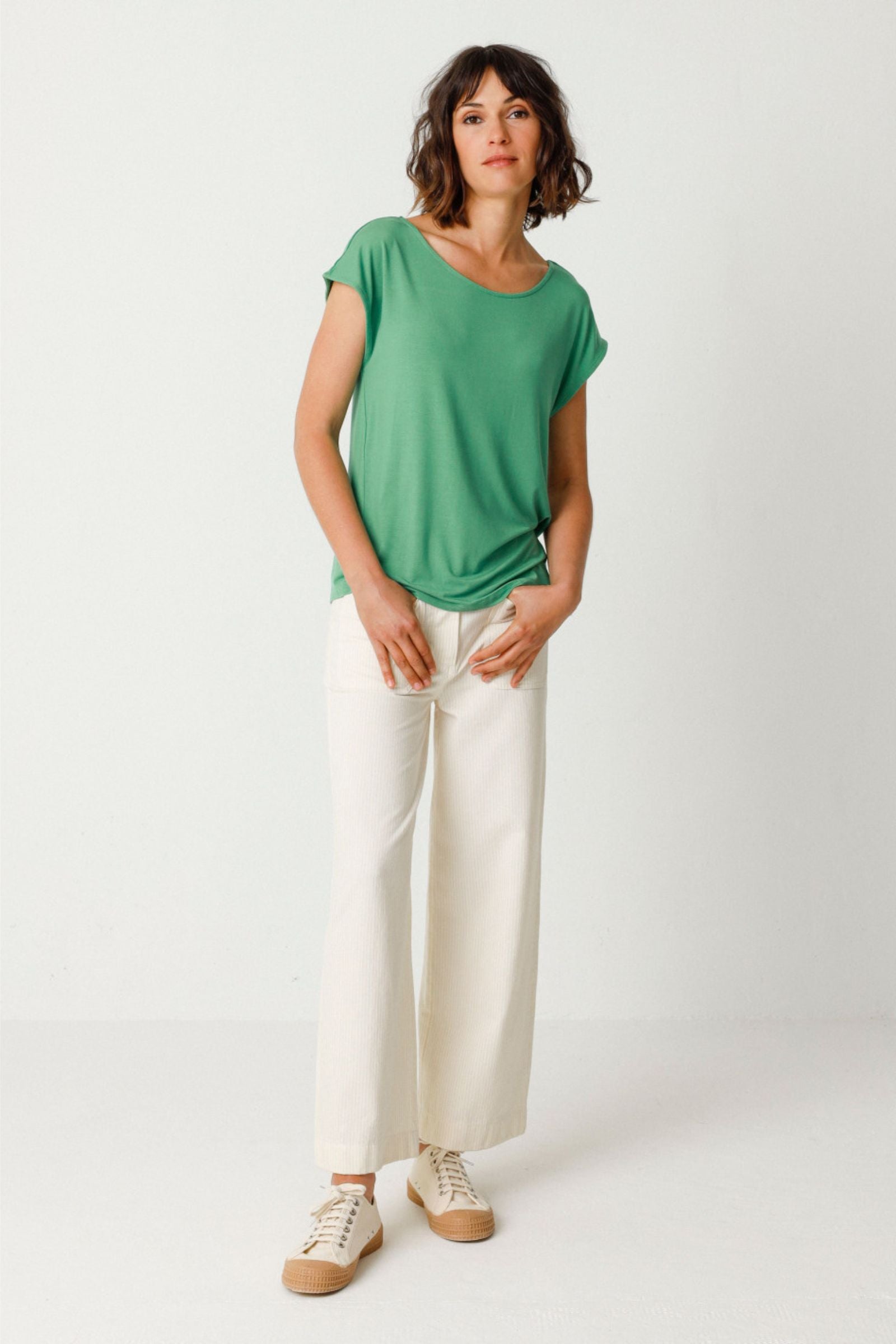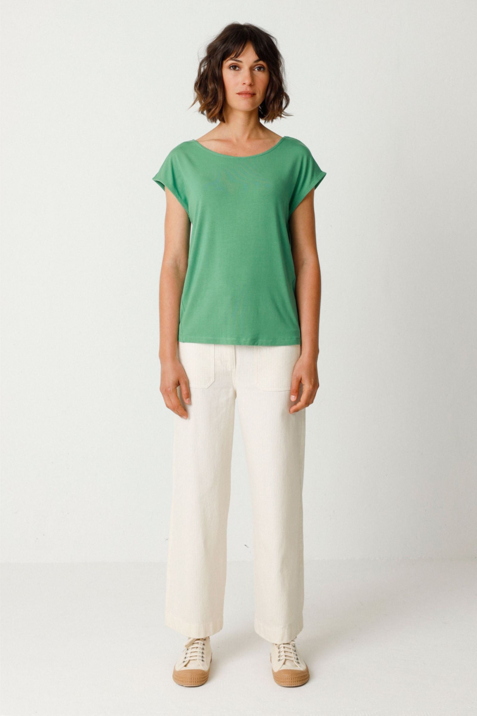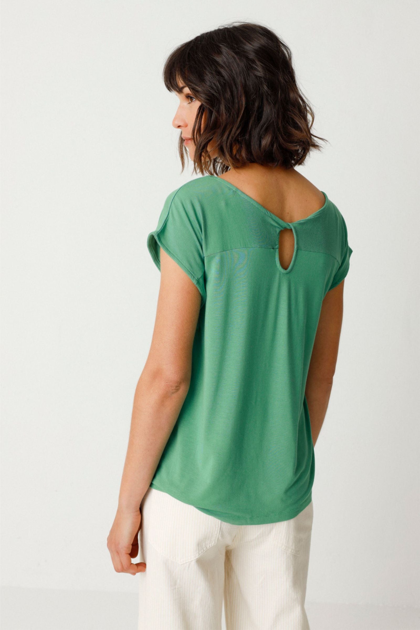 Schlichtes, kurzärmeliges T-Shirt von SKFK mit weichem Stoff und einem verspielten Detail am Rücken. Perfekt für einen komfortablen und stylischen Look in einem sommerlichen Grün.