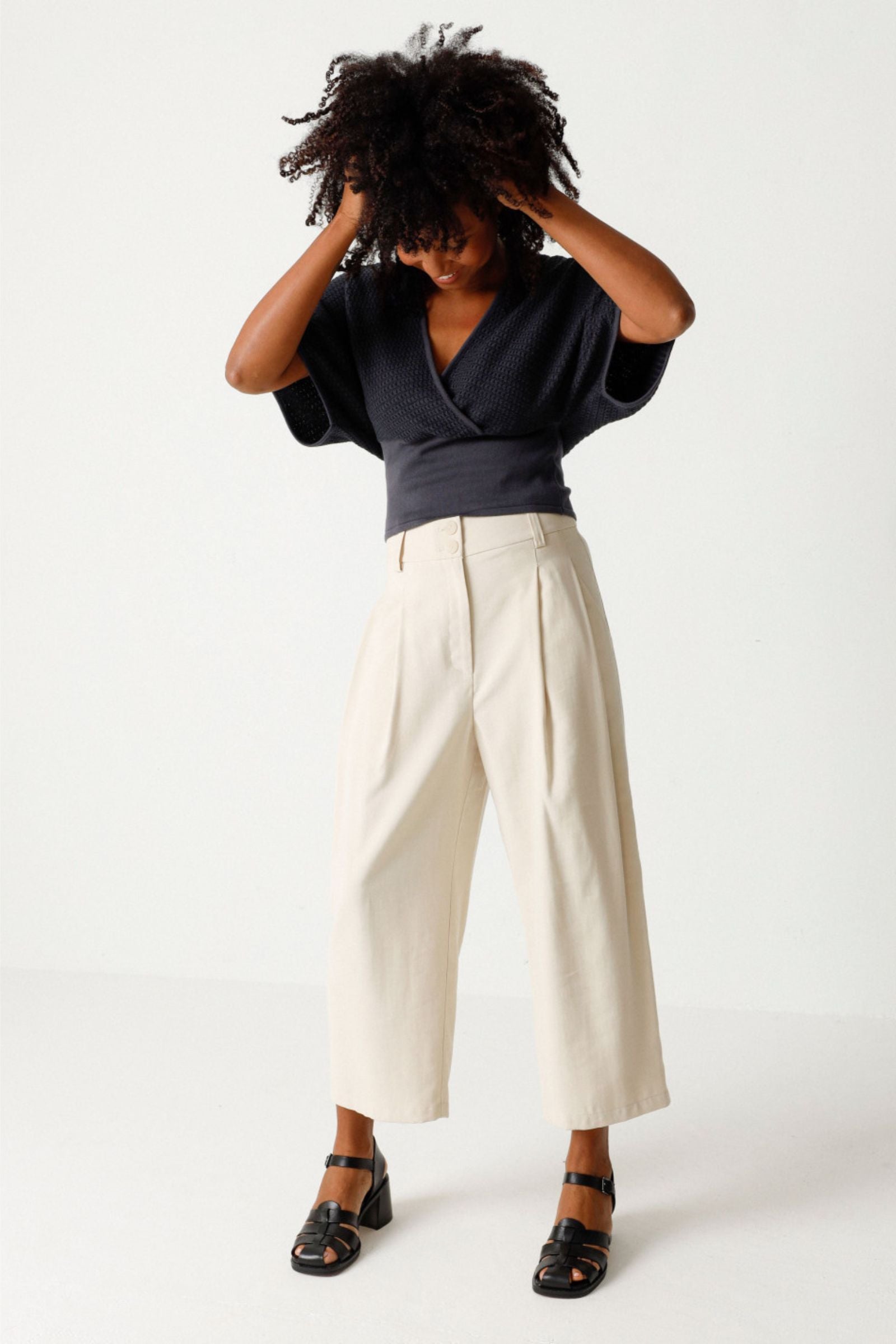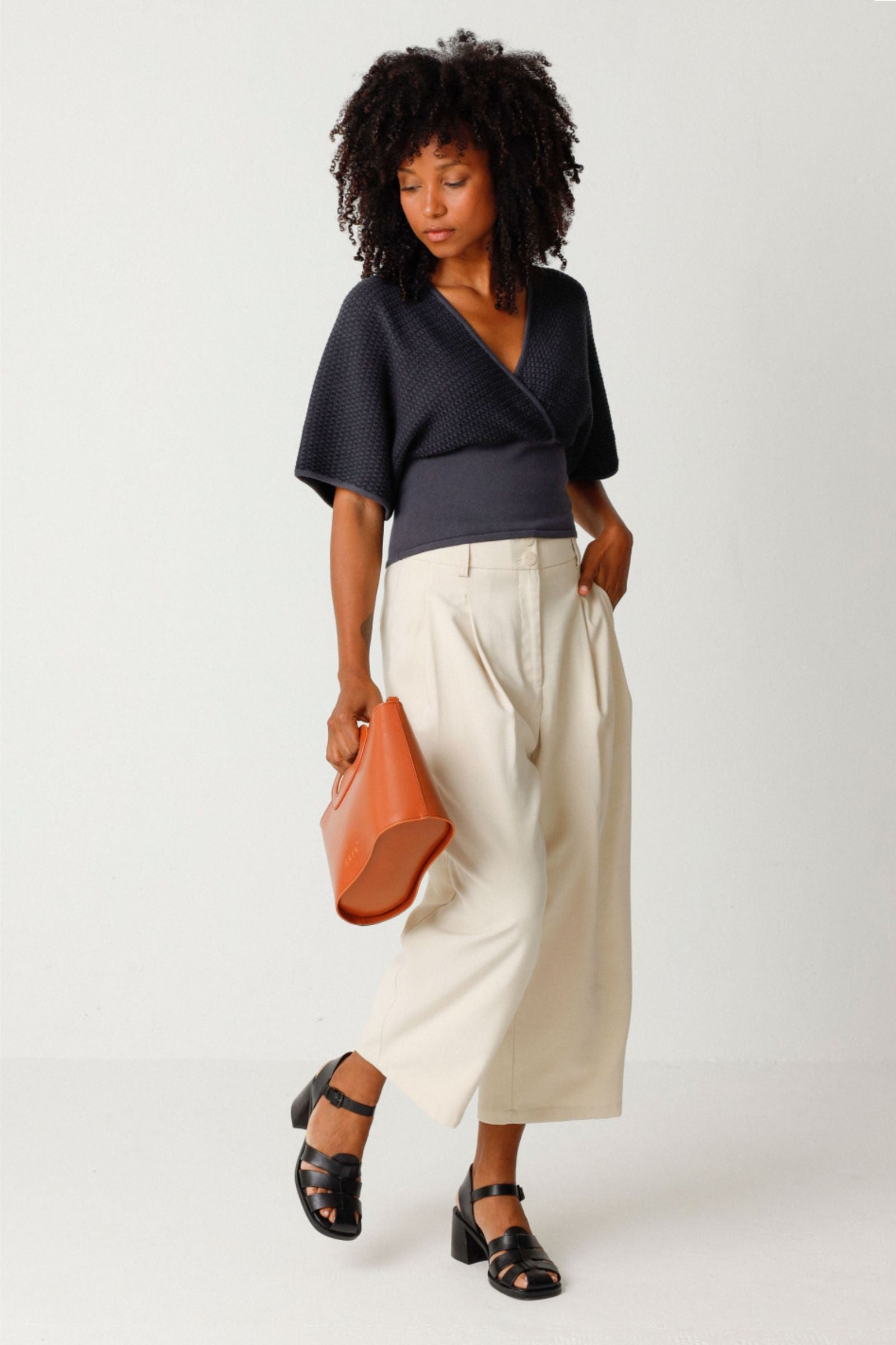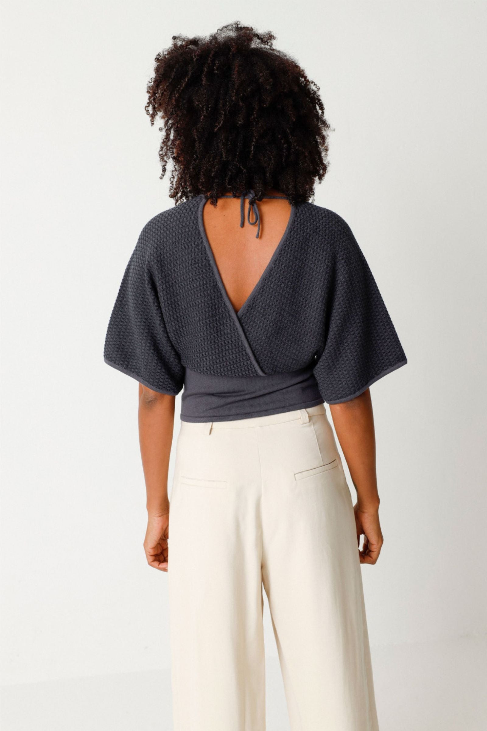 Dieses T-Shirt von SKFK ist aus GOTS-zertifizierter Bio-Baumwolle gefertigt. Mit seinem tiefen V-Ausschnitt vorne und hinten, den Kimono-Ärmeln und der taillierten Passform bietet es einen modernen Look. Der Rücken lässt sich mit einem Bindeband schließen.