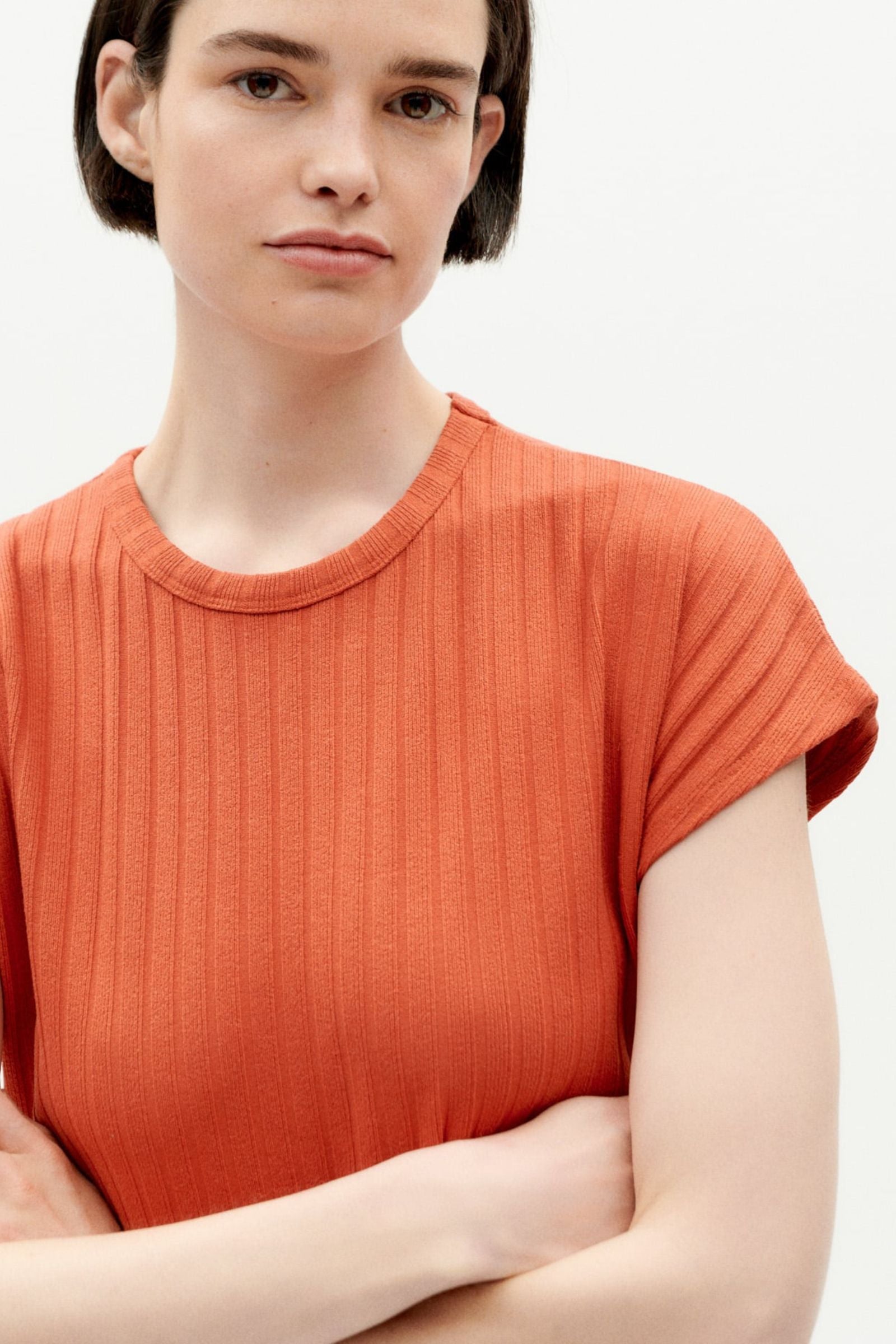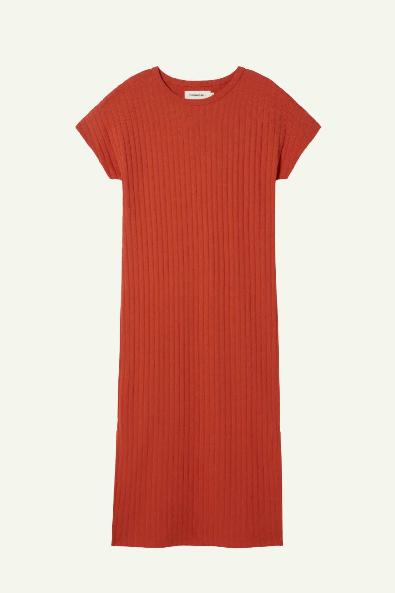 Dieses orange Kirschkleid von Thinking MU ist aus ECOVERO™ Viskose gefertigt und hat einen geraden Schnitt sowie einen Rundhalsausschnitt. Durch die kurzen Ärmel und die Midi-Länge ist es perfekt für den Sommer geeignet.