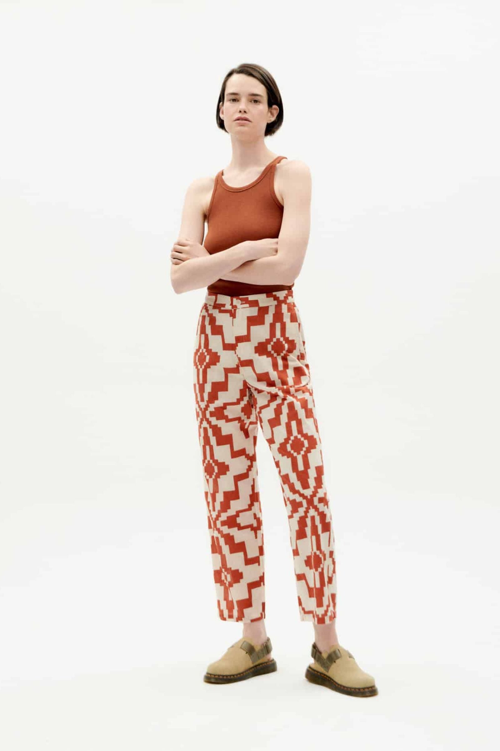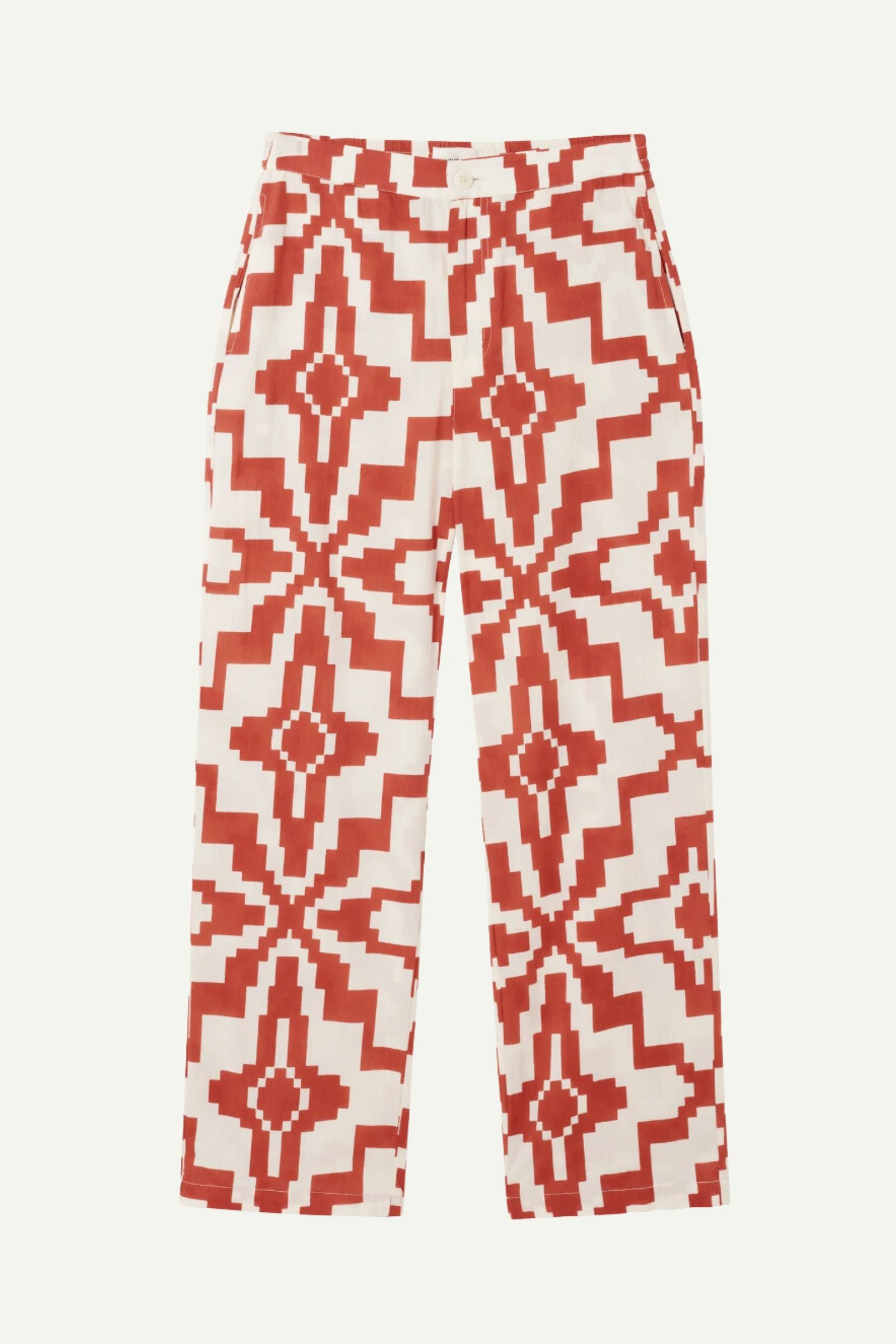 Diese lockere Hose von Thinking MU besteht aus 100% Bio-Baumwolle. Sie hat einen Reißverschluss mit Knopf, vorderseitige Taschen und eine falsche Gesäßtasche. Die verkürzte Länge des Kleidungsstücks verleiht ihm einen modernen Look und passt so perfekt zu Sneakers, Ballerinas und Sandalen.
