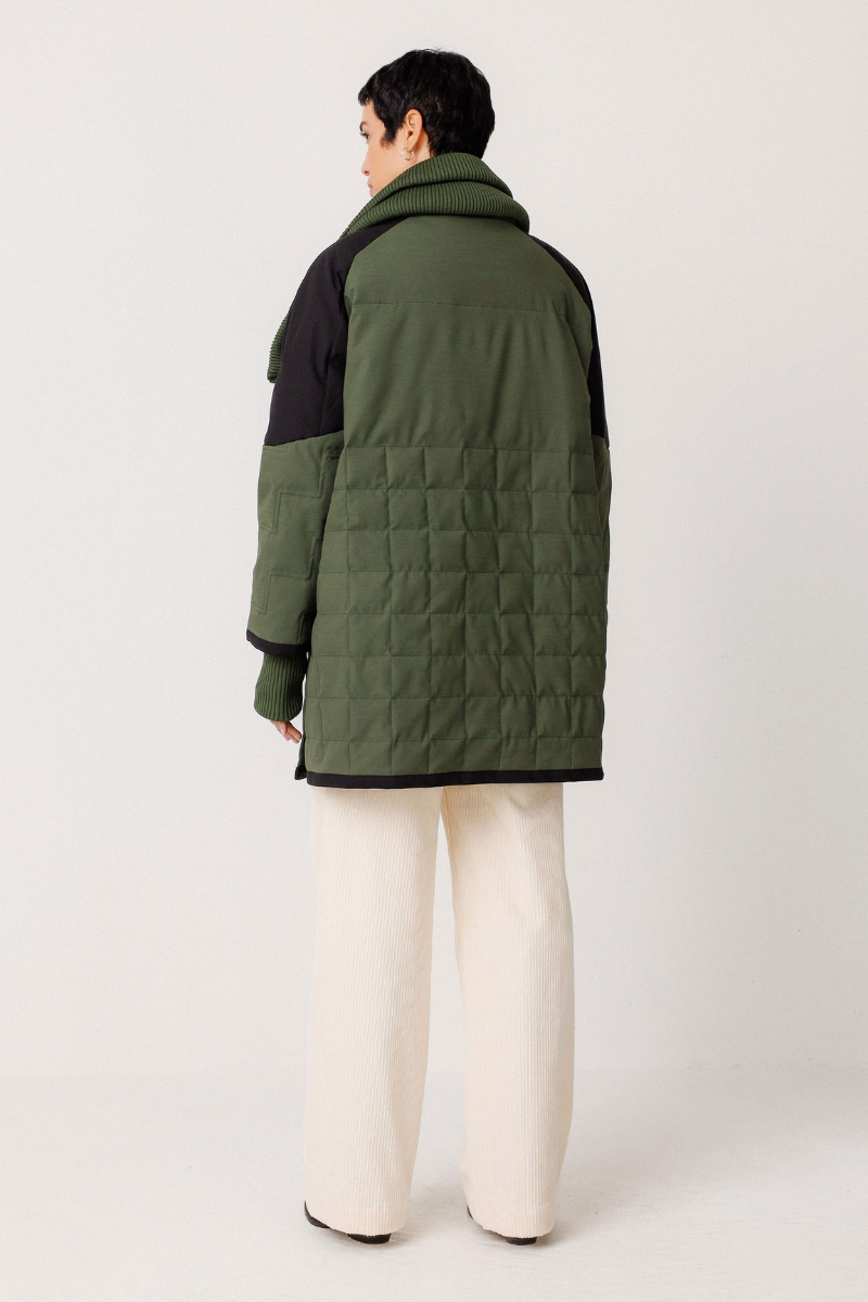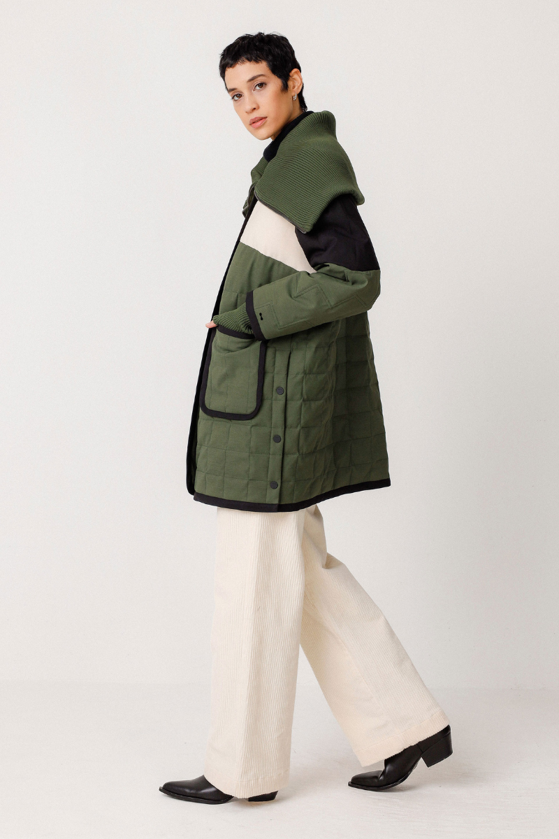 Dieser dreifarbige Mantel von SKFK ist nicht nur schick, sondern auch funktional. Der gerippte Rollkragen und die großen Taschen machen ihn zu einem idealen Begleiter in der kalten Jahreszeit. Mit Reißverschluss und Knöpfen und zusätzlichen Knöpfen an den Seitenschlitzen. Eine einzigartige Zusammenarbeit mit Martina Spetlova und SKFK.