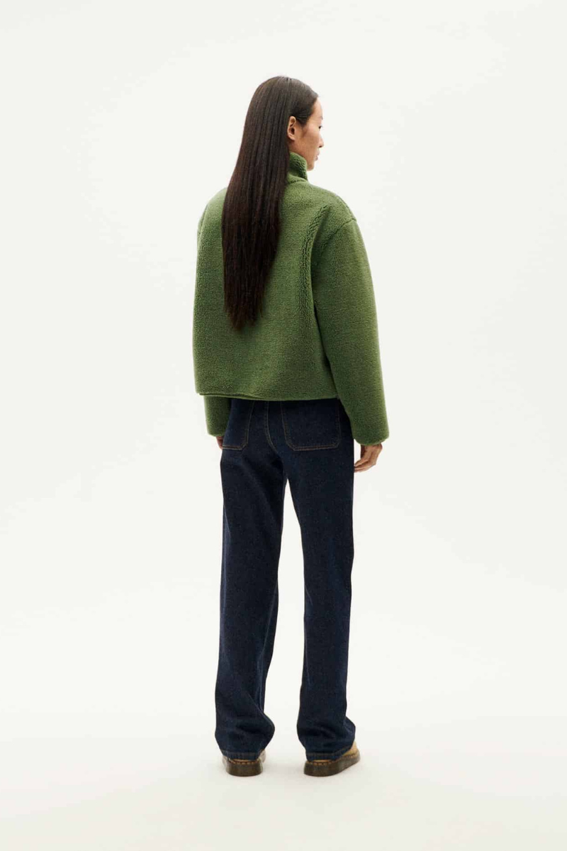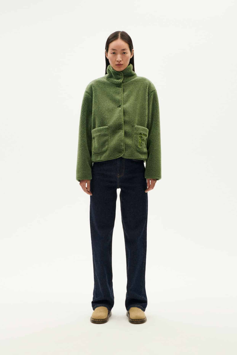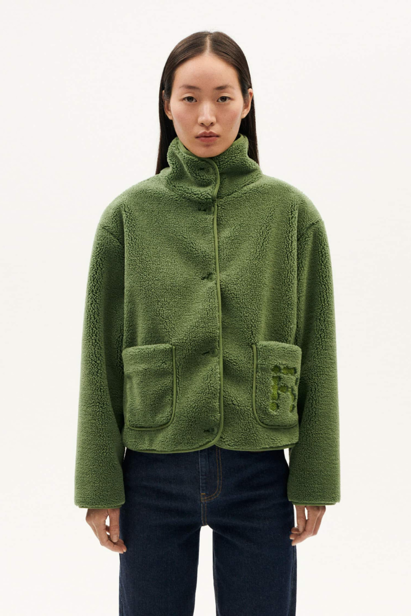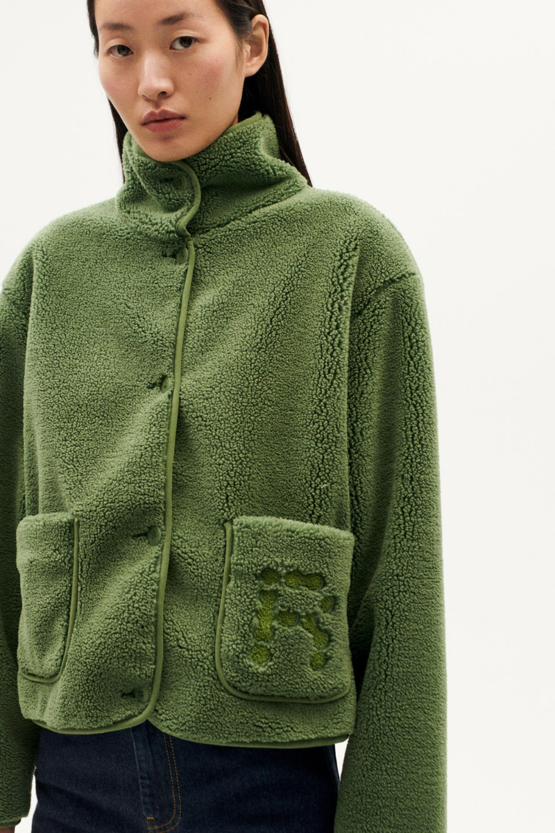 Die Jacke Cactus von Thinking MU besticht durch ihren hohen Kragen und langen Ärmel für einen angenehmen Tragekomfort. Die reguläre Passform und die Knopfleiste verleihen der Jacke einen zeitlosen Look. Mit praktischen Vordertaschen und einer Innentasche bietet sie ausreichend Stauraum. Gefertigt aus recyceltem Polyester und dickem Schafsfell für Wärme und Nachhaltigkeit. Kurze Länge für eine moderne Optik.