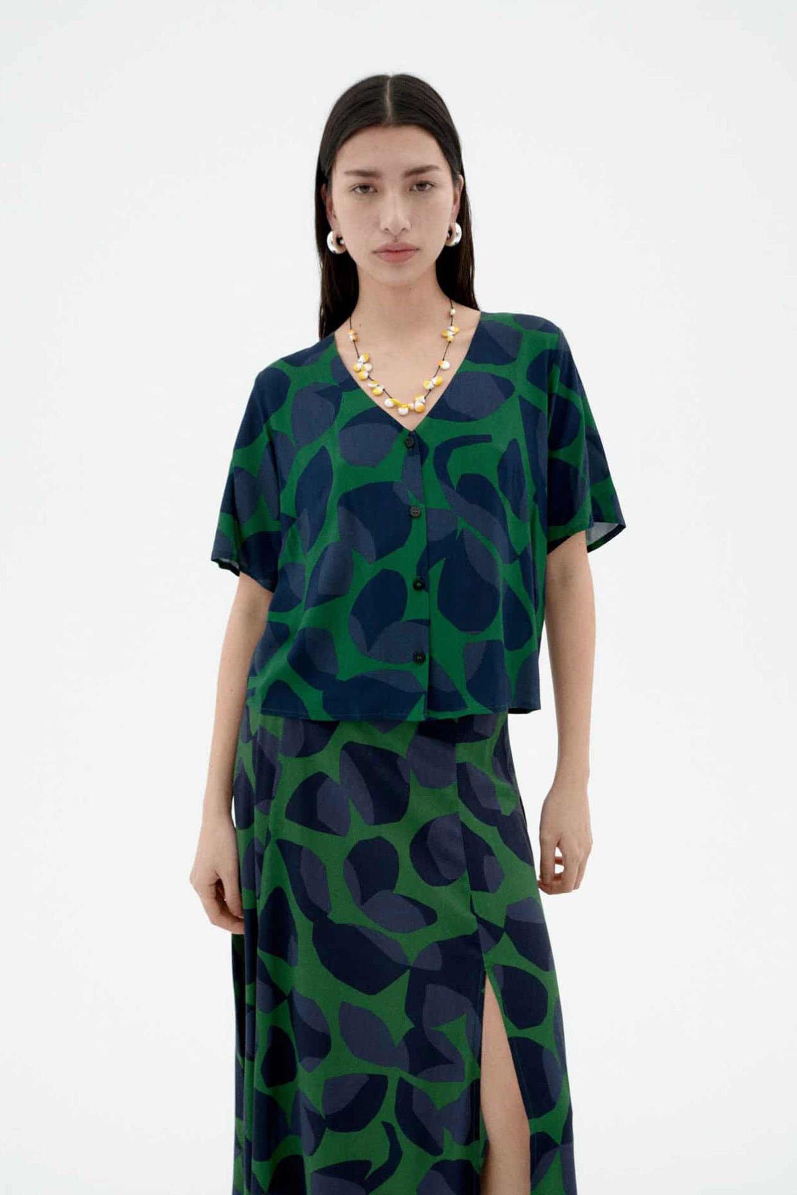 Bluse von Thinking MU mit V-Ausschnitt und Knopfleiste aus leichter Ecovero Viskose und nachhaltiger Produktion.