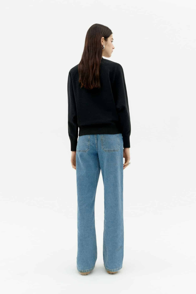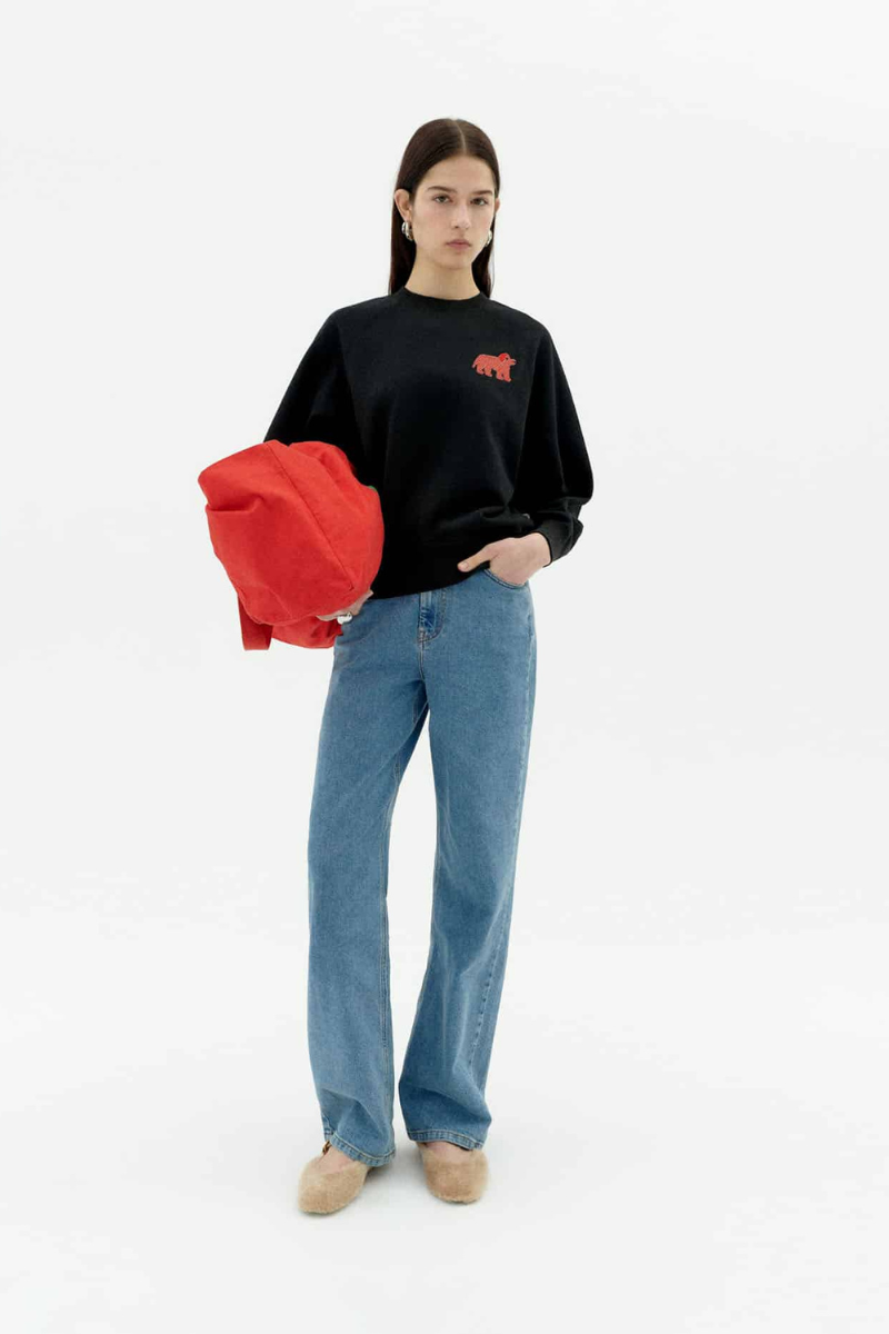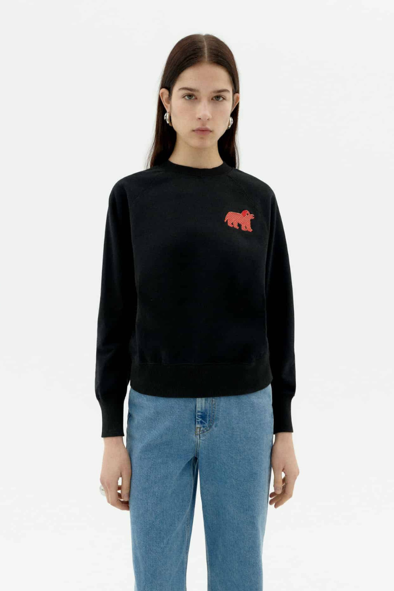 Dieser schwarze Pullover von Thinking MU ist aus Bio-Baumwolle gefertigt und in Zusammenarbeit mit Jochen Gerner entstanden. Die Stickerei zeigt das Werk des Künstlers. Mit Rundhalsausschnitt, langen Ärmeln und lässiger Passform bietet er ein angenehmes Tragegefühl. Der Stoff ist dick und das Oberteil endet auf normaler Länge.