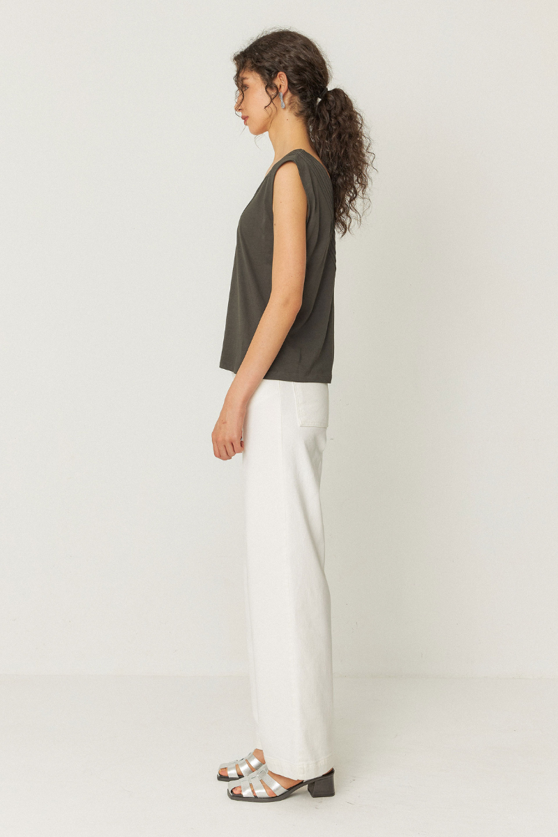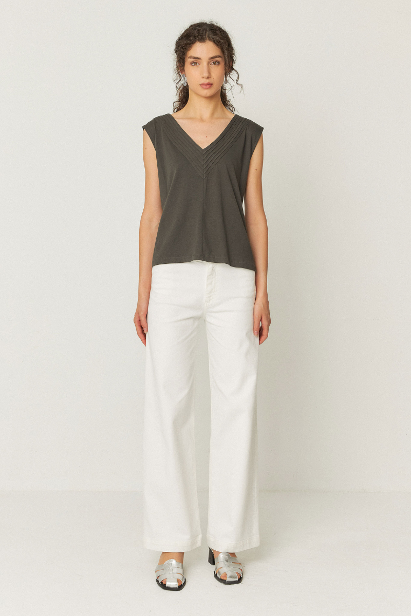 Dieses T-Shirt von SKFK mit V-Ausschnitt ist ärmellos und hat eine hübsche Raffung am Ausschnitt. Der gerade Schnitt sorgt für eine tolle Passform. Perfekt für einen lässigen und dennoch schicken Look.