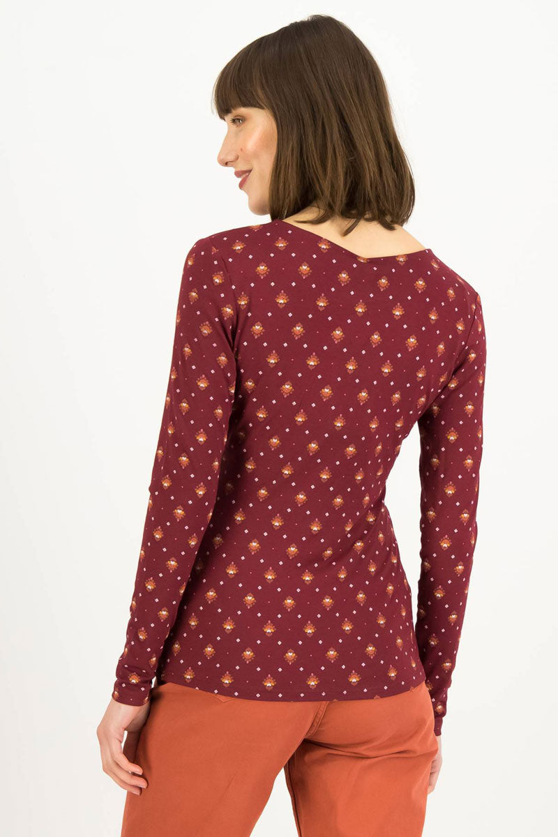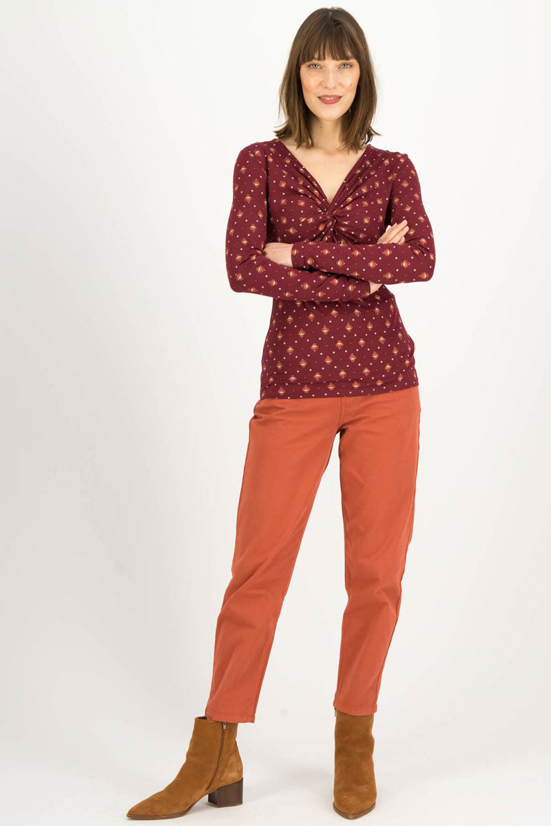 Körpernah geschnittenes Langarmshirt aus anschmiegsamem Viskose-Jersey in ökologisch wertvoller LENZING™ ECOVERO™-Qualität. Das verspielte Knoten-Arrangement auf der Brust stellt die blutsgeschwisterliche Schnittkunst unter Beweis und setzt jedes Dekolleté gekonnt in Szene.