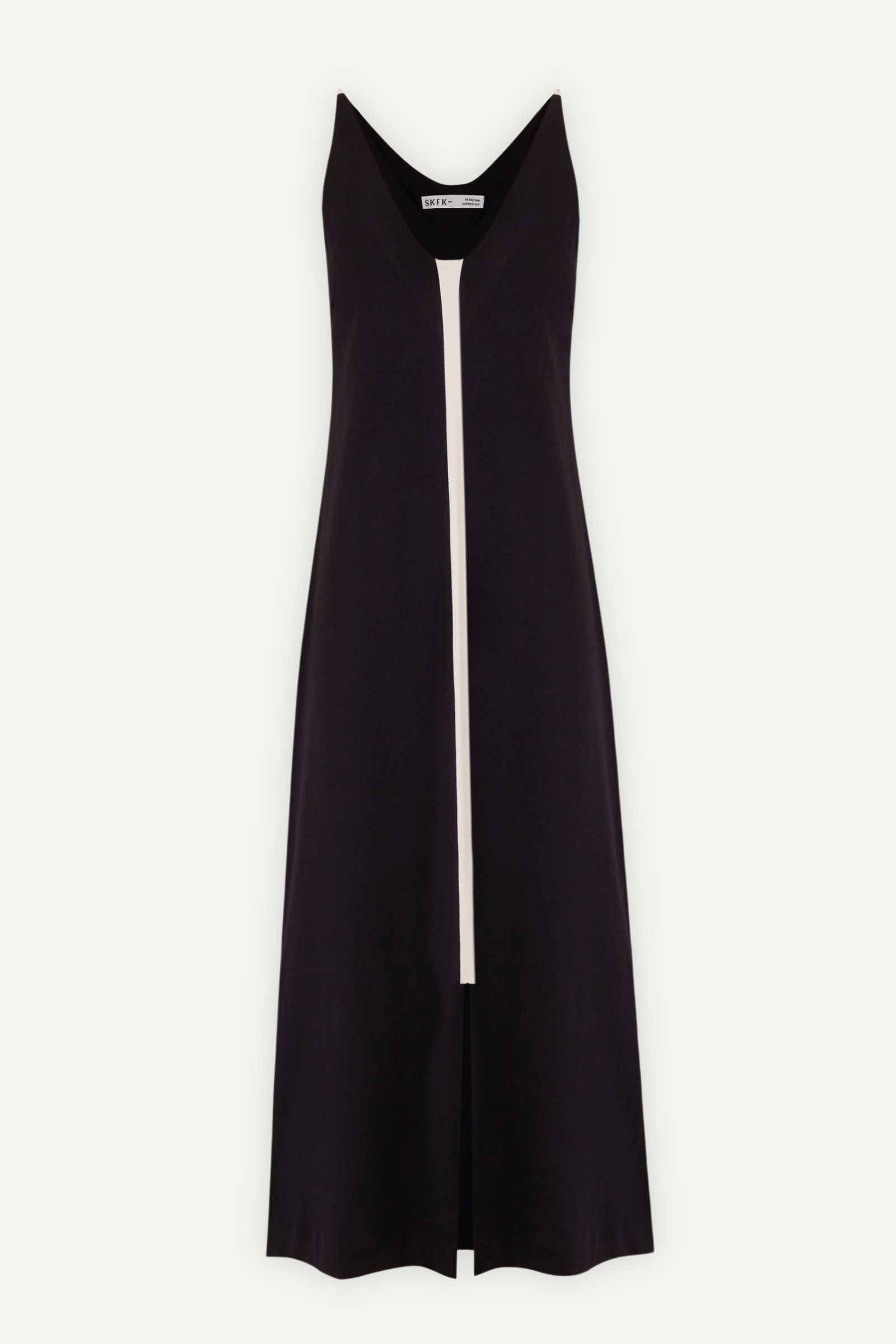 Ärmelloses Midikleid in A-Linie von SKFK mit V-Ausschnitt und Schlitz vorne, mit kontrastierendem Einsatz vorne und hinten.