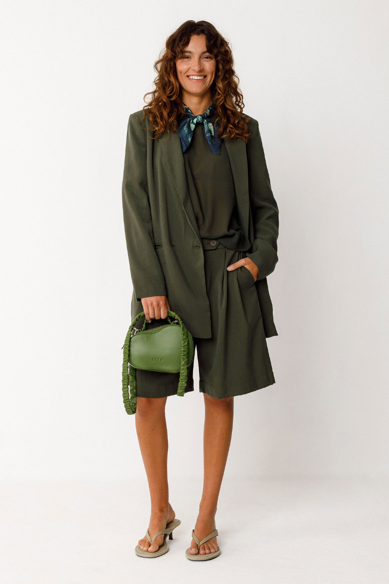 Oversized Top von SKFK in Dunkelgrün mit 3/4-Ärmeln und leicht gerundetem Schnitt. Hergestellt aus 100% recyceltem Polyester mit kontrastierendem Strukturstoff an Ärmeln und Rückseite. Bequemer, unkomplizierter Fit – lässt sich vielseitig stylen für Büro, Freizeit oder als Set mit Shorts oder Rock.