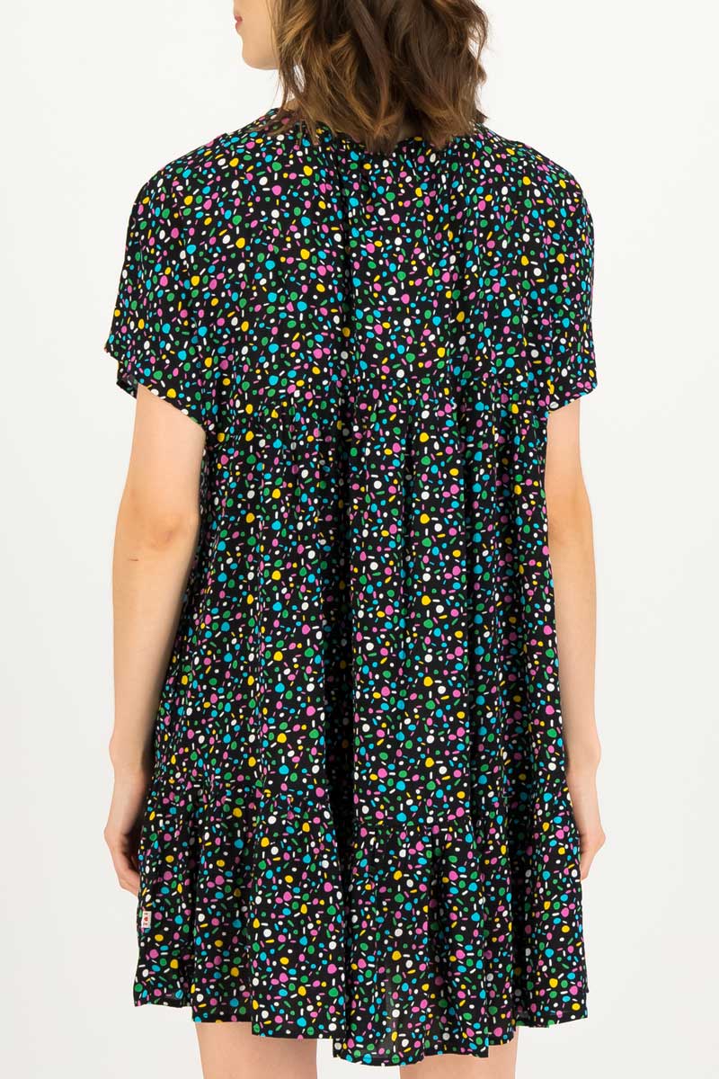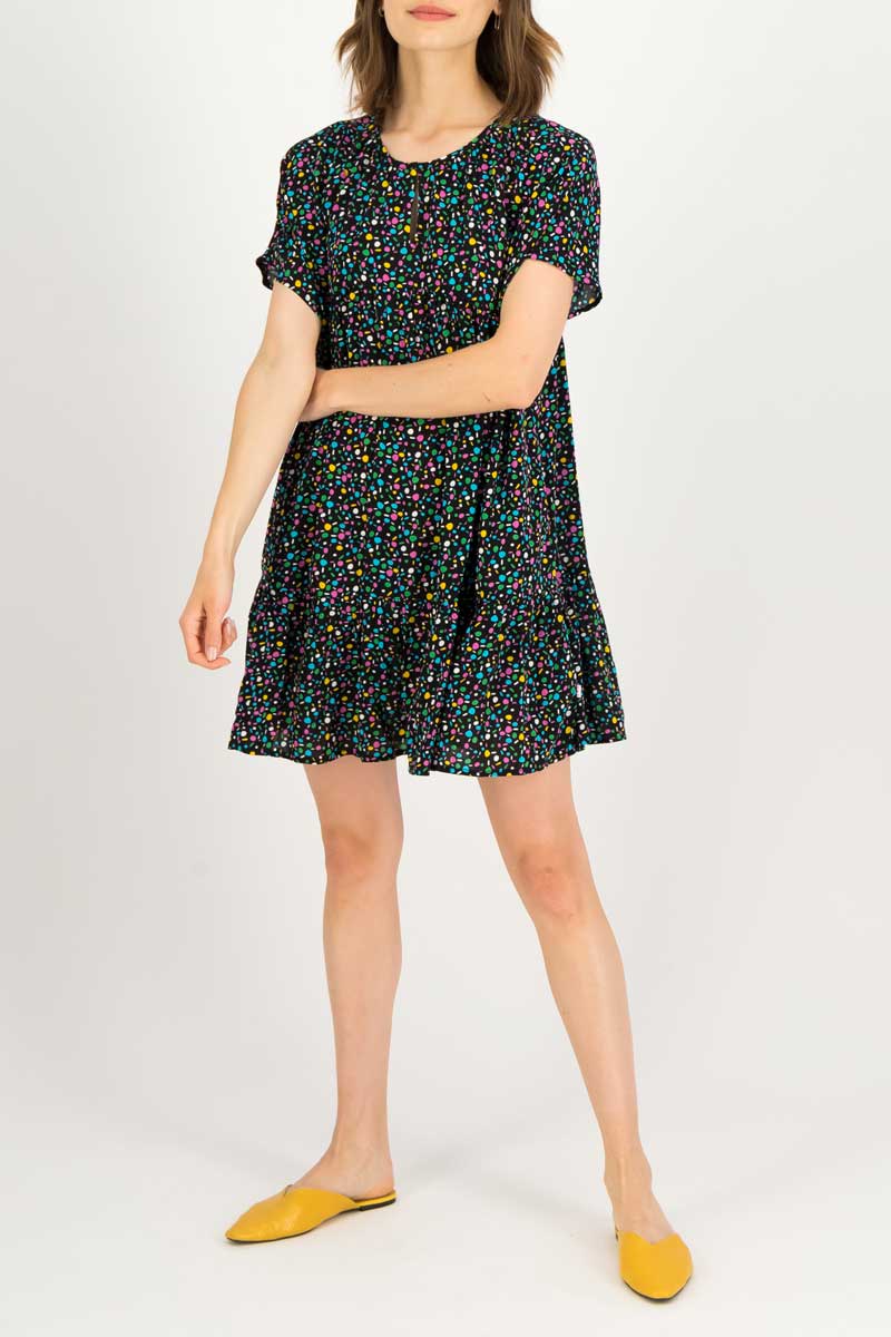 Der unkomplizierte Rundhalsausschnitt mit kleinem Schlitz in der vorderseitigen Mitte, kurze Ärmel mit weiter Passform und praktische Nahttaschen auf Hüfthöhe stehen für Alltagstauglichkeit, höchsten Tragekomfort und uneingeschränkte Bewegungsfreiheit. Verspielte Kräuselungen unterhalb der Brust und ein breiter Volant entlang des Saumes machen das knieumspielende Stoffglück letztlich rundum perfekt.