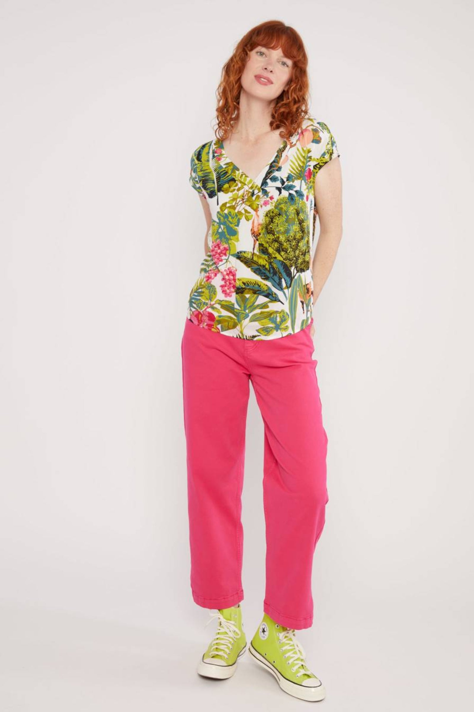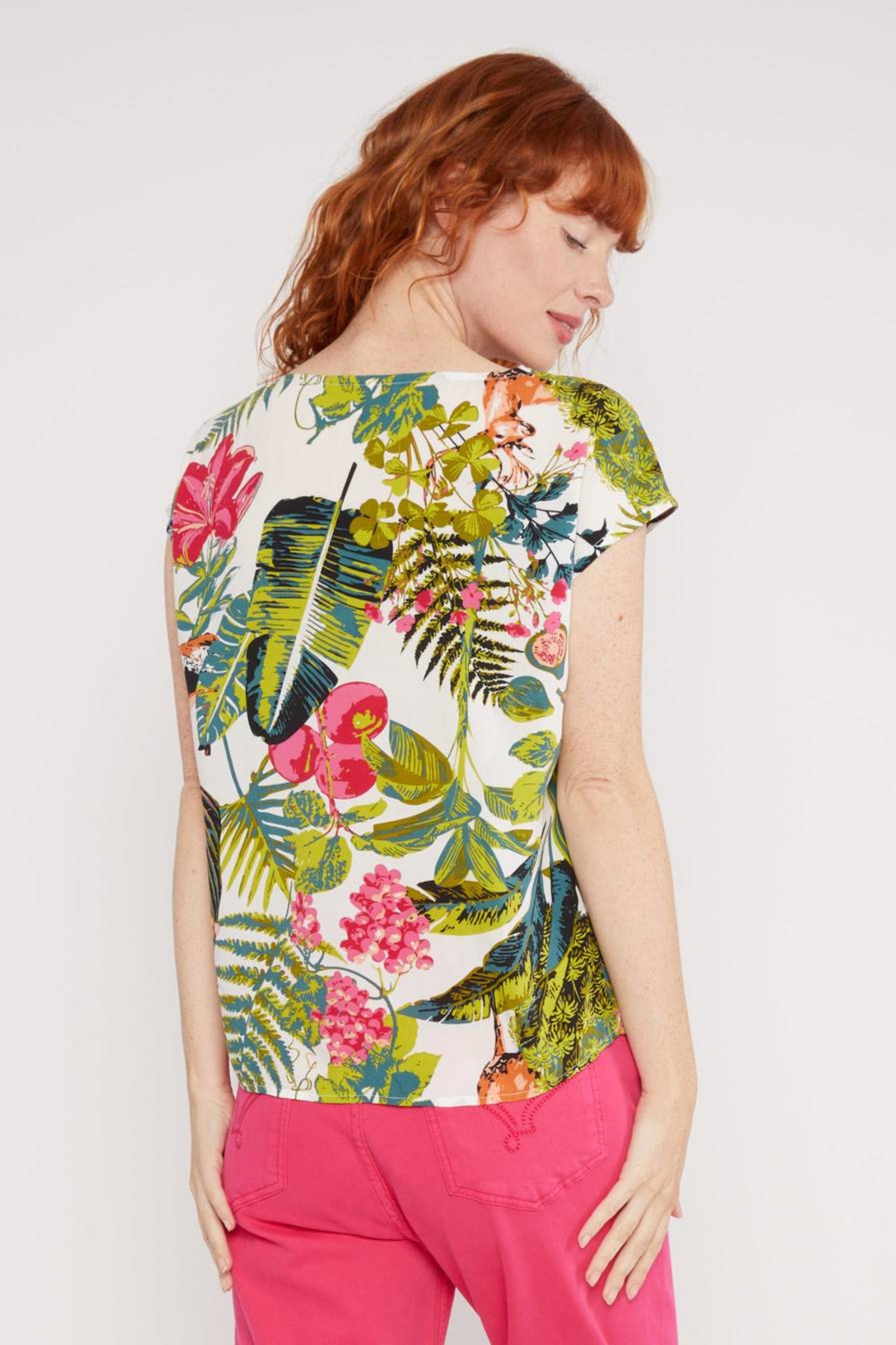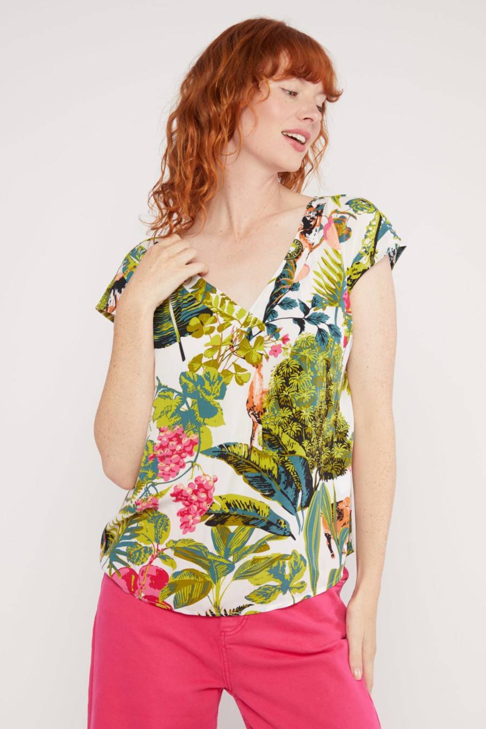 Der alltagstaugliche V-Ausschnitt mit breiter Blende und die dekorative Falte unterhalb der Ausschnittspitze verleihen dieser leichten Bluse von Blutsgeschwister einen tropischen Touch. Die kurzen, angeschnittenen Ärmel machen die Bluse zu einem perfekten Begleiter für warme Tage.