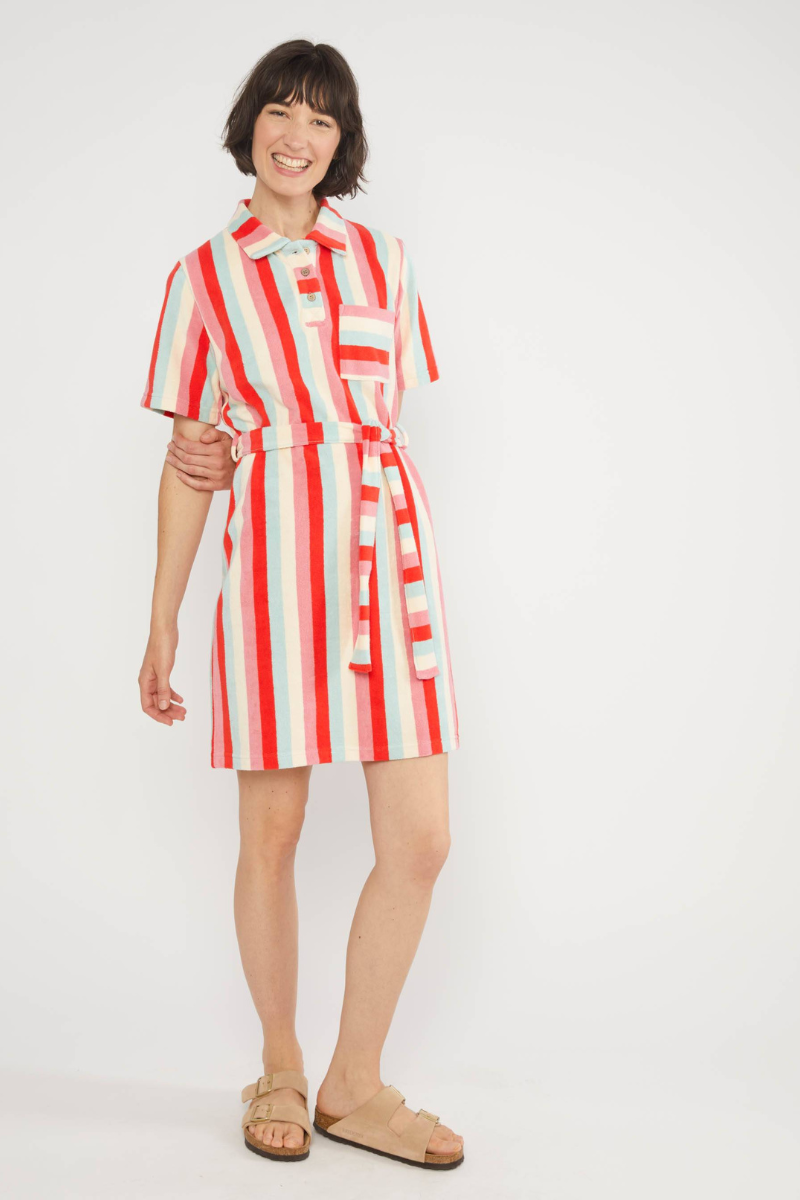 Erlebe Komfort und Style mit dem Frottee-Kleid im Poloshirt-Stil von Blutsgeschwister. Der weiche und flauschige Stoff sorgt für ein angenehmes Tragegefühl, während der lockere Fit und überschnittene Schultern für Bewegungsfreiheit und einen entspannten Look sorgen. Der rückwärtige Knopfverschluss und der abnehmbare Taillengürtel unterstreichen die sportlich-lässige Optik.