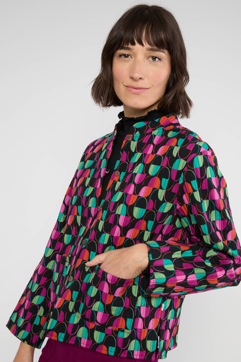 Die Jacke "Quilted Love Illusionist Of Dreams" von Blutsgeschwister überzeugt mit ihrem weichen, anschmiegsamen LENZING™ ECOVERO™ Viskose-Webstoff und einem wattierten, gesteppte Oberstoff für angenehmen Tragekomfort. Der gerade Schnitt, ergänzt durch legere, überschnittene Schultern und entspannte Ärmel, sorgt für eine moderne, lässige Silhouette. Umweltfreundliche Kokosnuss-Knöpfe, ein Stehkragen sowie dekorative Seitenschlitze am Saum setzen stilvolle Akzente. Praktische aufgesetzte Taschen und ein komfortables Rutschfutter runden diese vielseitige Jacke als perfekten Begleiter für jeden Tag ab.