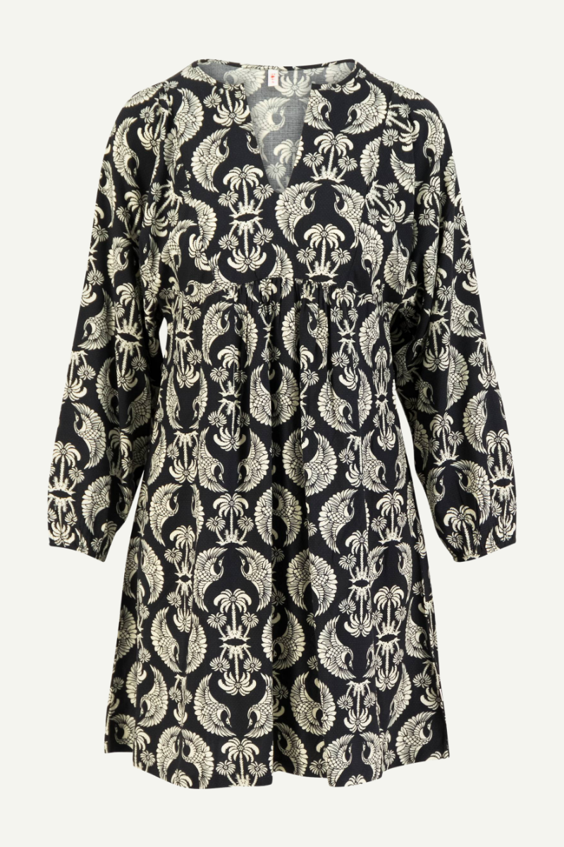 Dieses lässige Kurzkleid von Blutsgeschwister aus weichem, anschmiegsamem Viskose-Webstoff (LENZING™ ECOVERO™) überzeugt mit seinem femininen, aber ungezwungenen Look. Die leicht ausgestellte Rocksilhouette und der unkomplizierte V-Ausschnitt schaffen eine schmeichelnde Passform. Praktische Eingriffstaschen auf Hüfthöhe und locker geschnittene 3/4-Ärmel mit gerafften Bündchen sorgen für Komfort und vielseitigen Tragekomfort. Ein perfektes Kleid für mühelose Eleganz im Alltag.