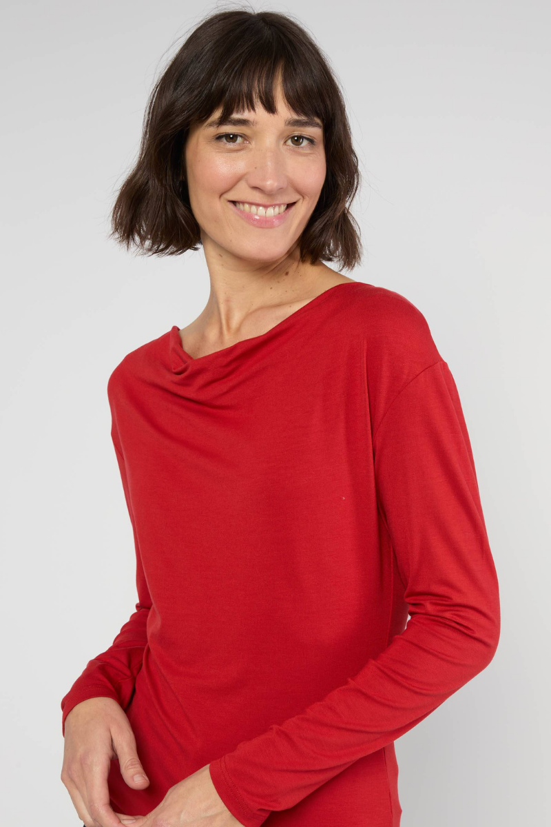 Dieses elegante Longsleeve von Blutsgeschwister aus weichem Viskose-Jersey mit LENZING™ ECOVERO™ und einem Hauch Elastan verbindet Komfort und Stil. Der raffinierte Wasserfallausschnitt verleiht einen femininen Akzent, während die schmal geschnittenen, langen Ärmel eine moderne, schlanke Silhouette schaffen. In zeitlosem Magma Rot ist dieses Shirt vielseitig kombinierbar und sorgt für einen selbstbewussten Auftritt. Ideal für alle, die lässige Eleganz mit einem besonderen Twist schätzen.
