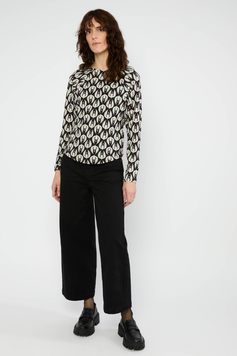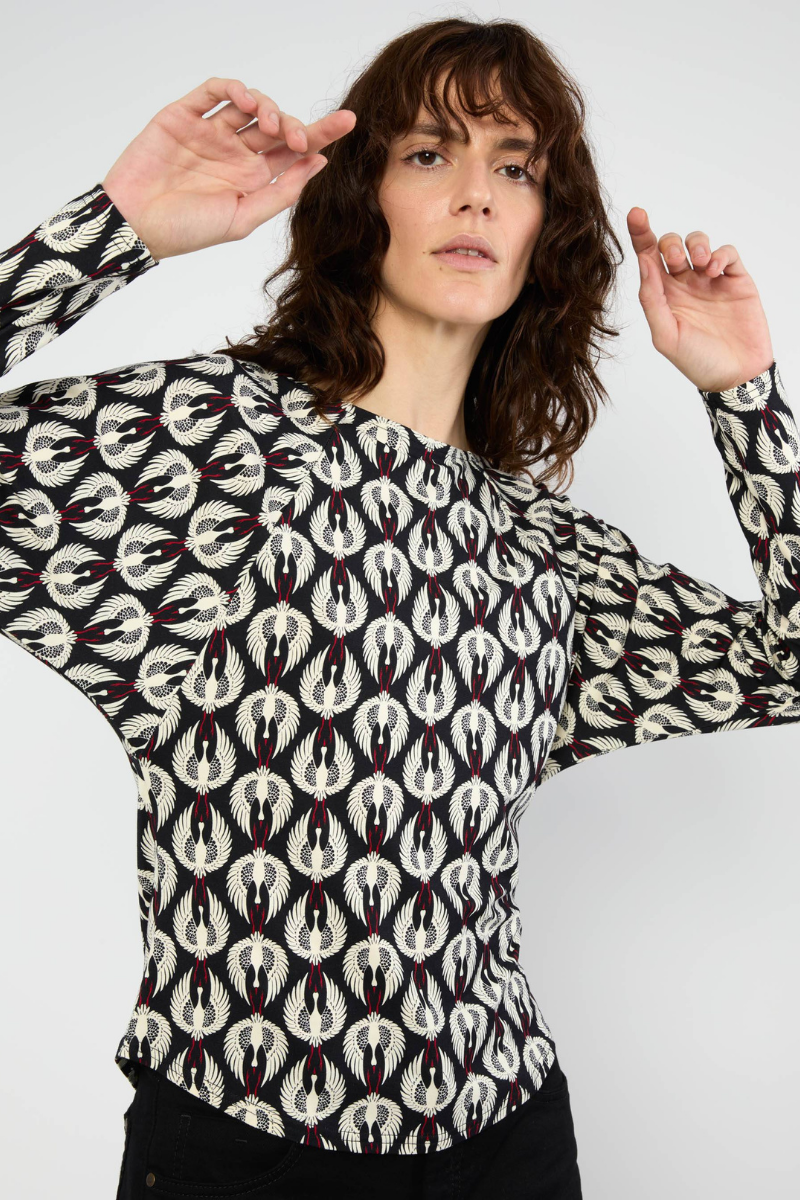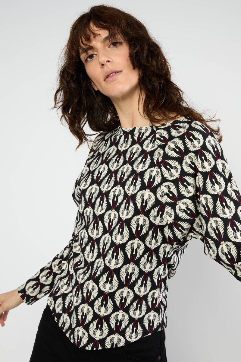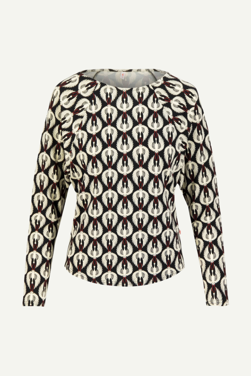 Dieses weiche Jersey-Longsleeve von Blutsgeschwister aus fließender Viskose mit LENZING™ ECOVERO™ und 5 % Elastan sorgt für ein angenehmes Tragegefühl und optimale Bewegungsfreiheit. Der moderne U-Boot-Ausschnitt und die gemütlichen Raglanärmel, die in weit geschnittene Fledermausärmel übergehen, schaffen eine lässige, entspannte Silhouette. Perfekt für den Alltag, bleibt das Shirt formstabil und bietet Komfort mit Stil.