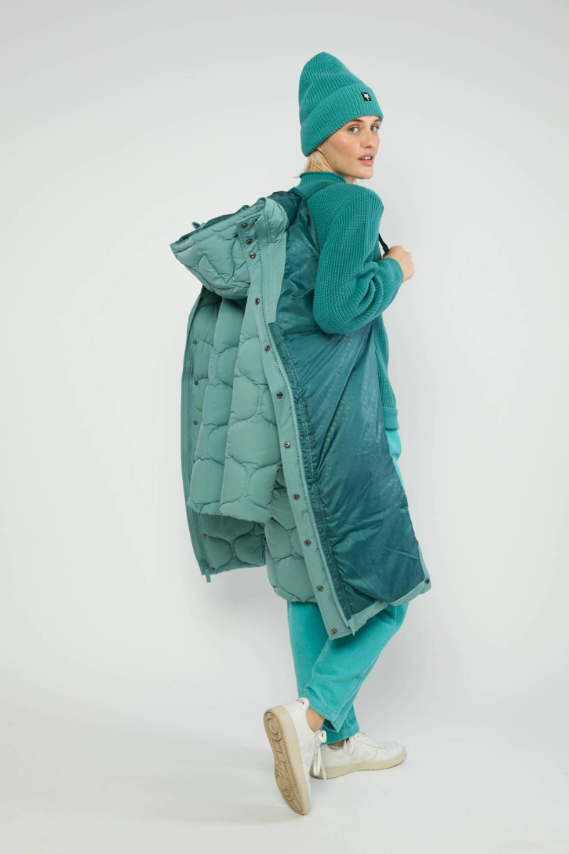 Der knielange Wintermantel „No Down Mister cold retro blue“ von Blutsgeschwister kombiniert nachhaltige Wärme mit durchdachtem Design. Gefüllt mit innovativer, federloser Sorona® Aura-Faser, bietet er ein leichtes Tragegefühl bei zuverlässigem Schutz vor Kälte. Die wasserdichte Membran mit 2.000 mm Wassersäule hält Nässe fern, während die großzügige Kapuze und der Windfang an den Ärmeln zusätzlichen Schutz bieten. Das praktische Schulter-Tragegurtsystem im Innenfutter sorgt für Komfort unterwegs. Mit handlichem 2-Wege-Reißverschluss, Kinnschutz und stylischem Blutsgeschwister-Patch ist dieser Mantel funktional, modern und umweltbewusst zugleich.
