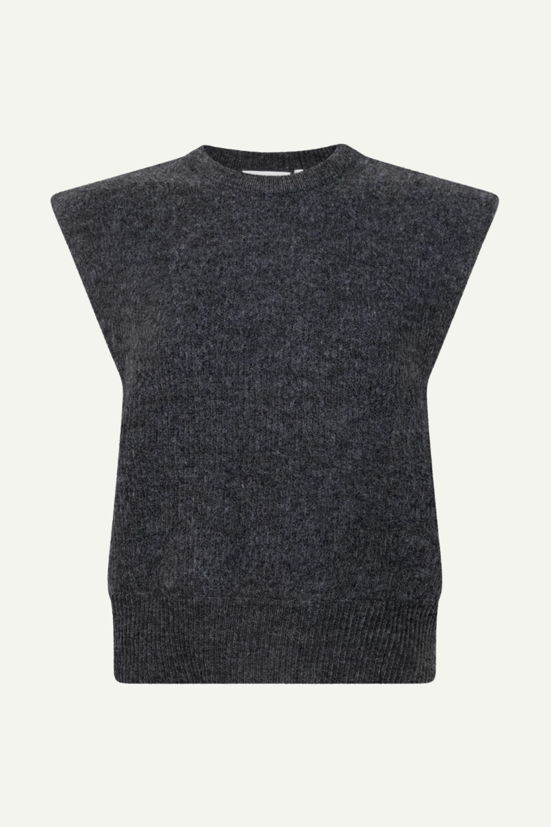 Die Pullover-Weste Alindra Strick von Another Label vereint weiche Materialqualität mit einem modernen, strukturierten Look. Der entspannte Schnitt sorgt für angenehmen Tragekomfort, während die dezenten Schulterpolster und der klassische, gerippte Rundhalsausschnitt eine elegante Silhouette formen. Ideal kombinierbar mit weiter Hose oder Jeans für einen stilvollen Alltagsauftritt.