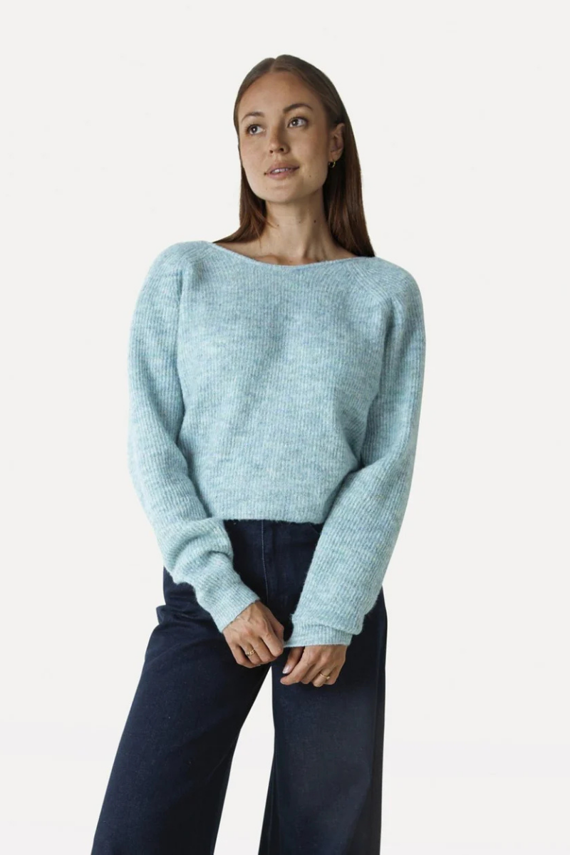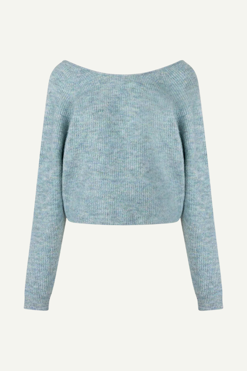 Der Pullover "Aladea Knitted Pull" von ANOTHER LABEL in Blue Heaven Melee vereint Komfort und Stil auf besondere Weise. Das offene Rückendetail mit modischem Knoten setzt einen eleganten Akzent, während der reguläre Schnitt und die leicht verkürzte Länge die Silhouette vorteilhaft betonen. Aus fein weichem, leicht flauschigem Material gefertigt, bietet dieser Pullover ein angenehmes Tragegefühl – ideal, um jedem Outfit eine raffinierte Note zu verleihen.