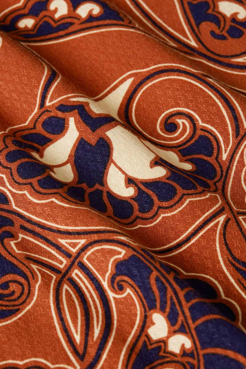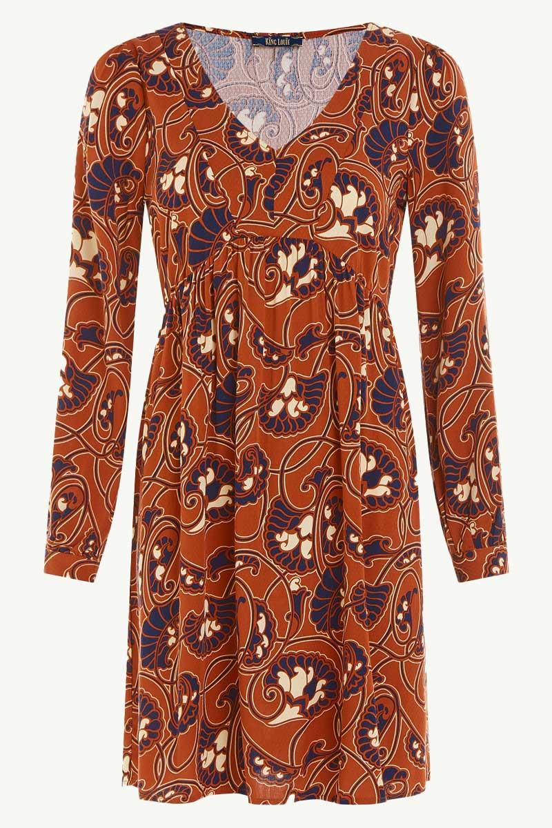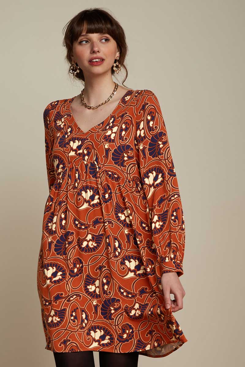 Das Kleid Marjorie Cecilia Spicy Brown ist ein kurzes Kleid aus einem Webstoff aus nachhaltiger Viskose. Es hat einen V-Ausschnitt, lange Ballonärmel und dekorative Raffungen. Der fließende Stoff mit Blumenmuster sorgt für einen trendigen Look.