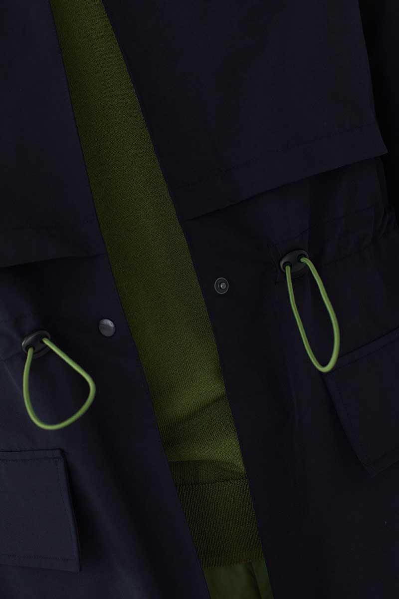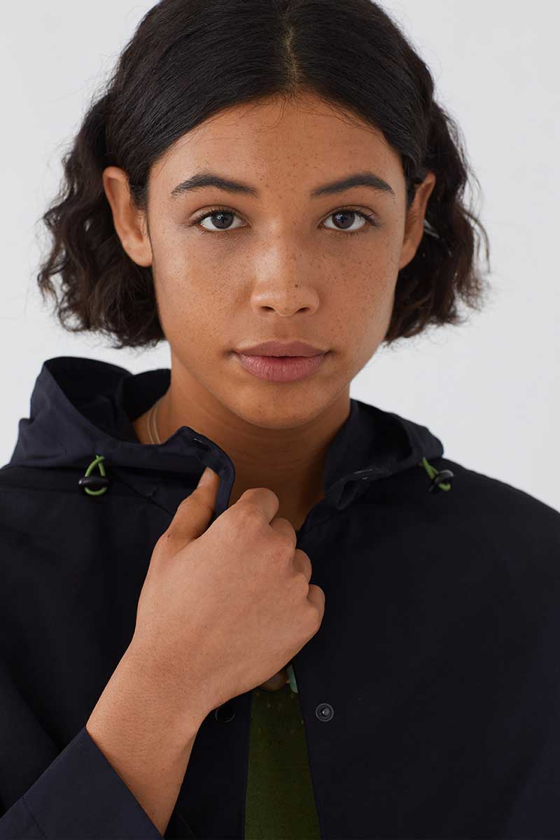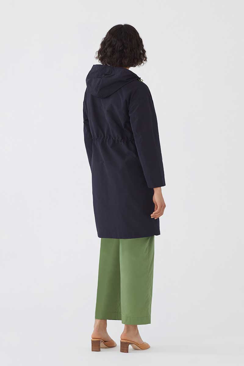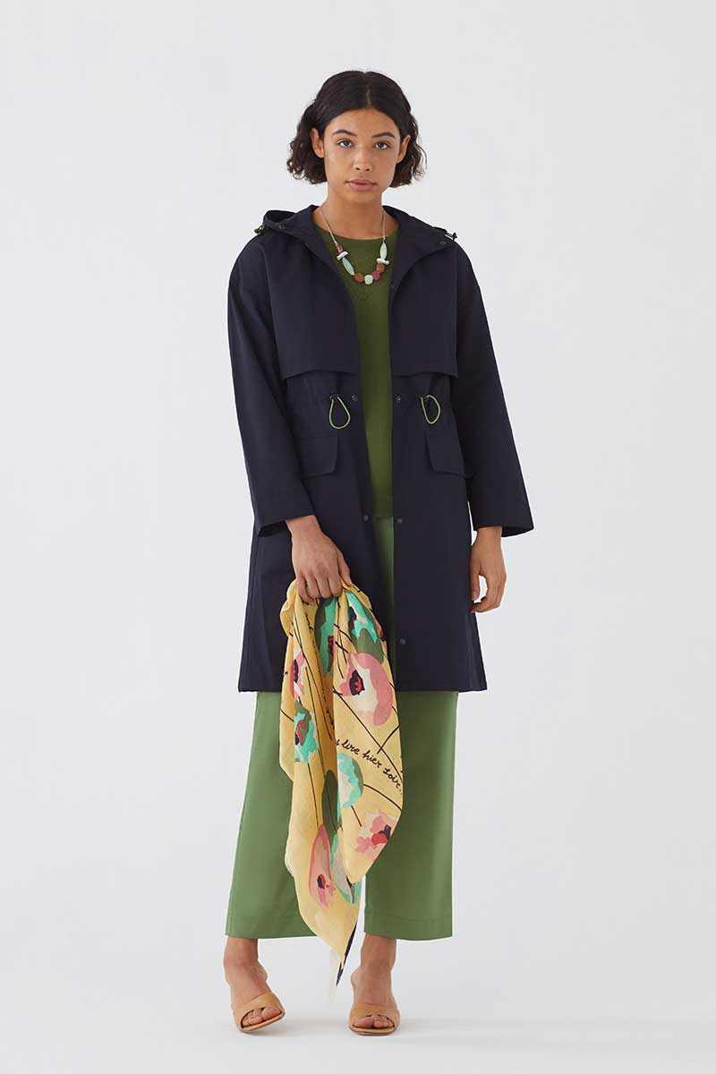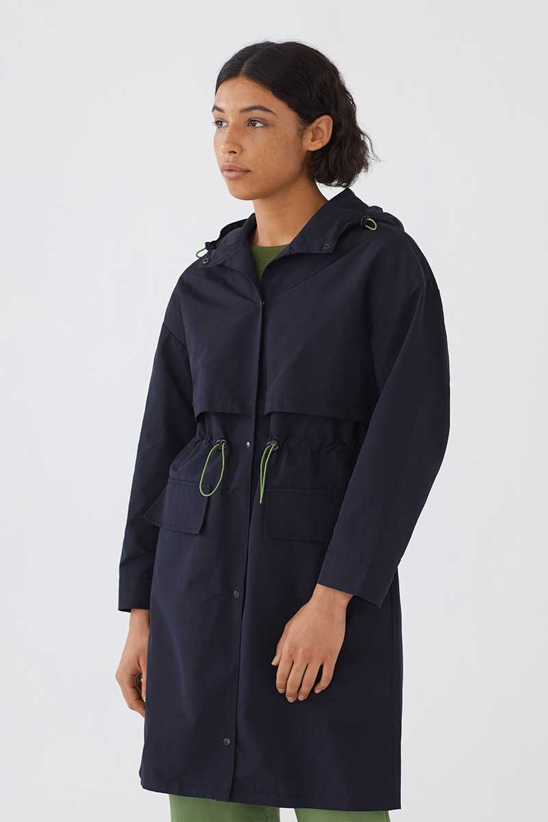 Praktische und Stilvolle Alltags-Jacke. Trench mit Kapuze und Pattentaschen. Elastischer Kordelzug in der Taille und Kapuze mit Knebelverschluss. Druckknopfverschluss vorne.