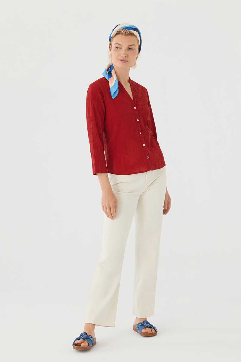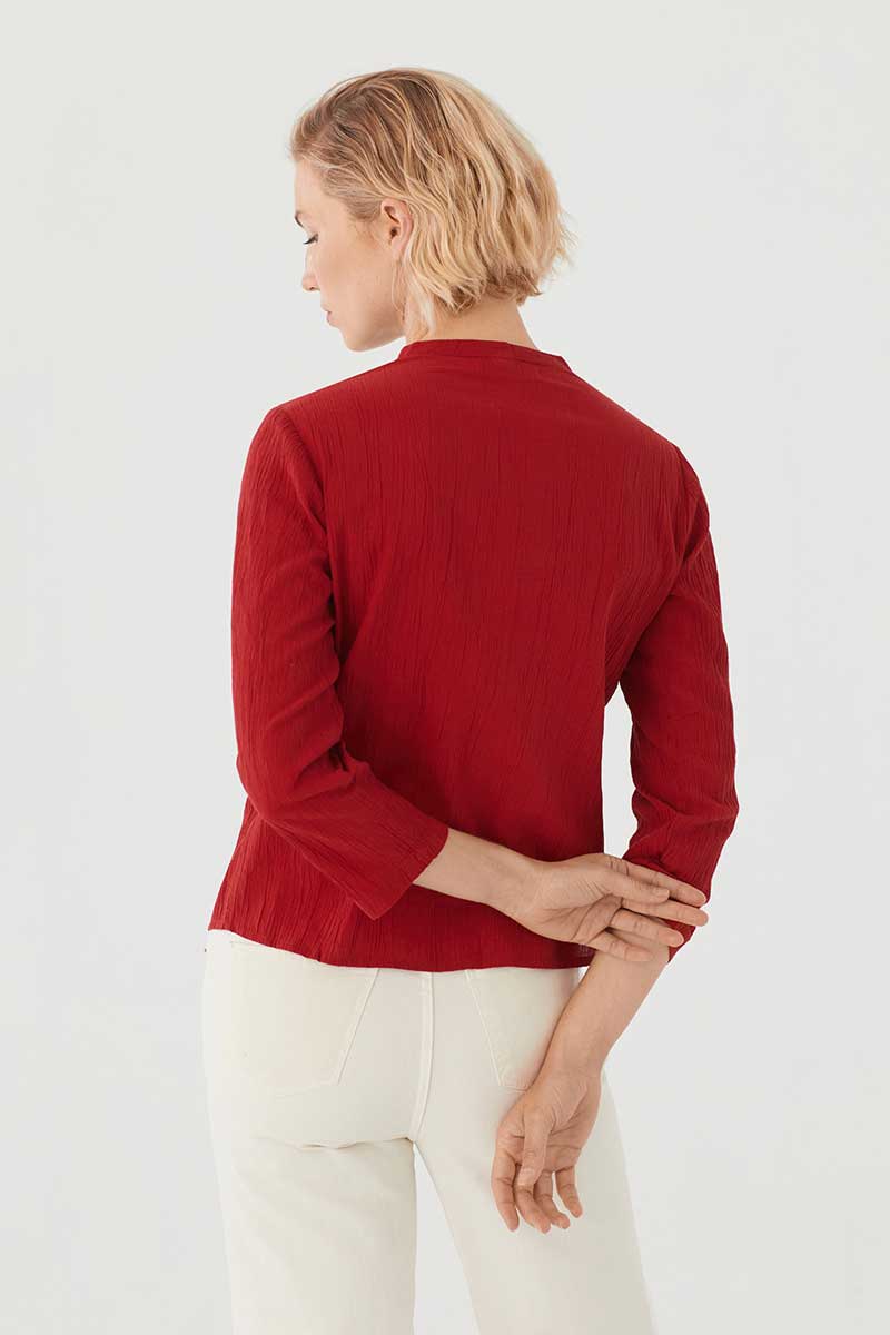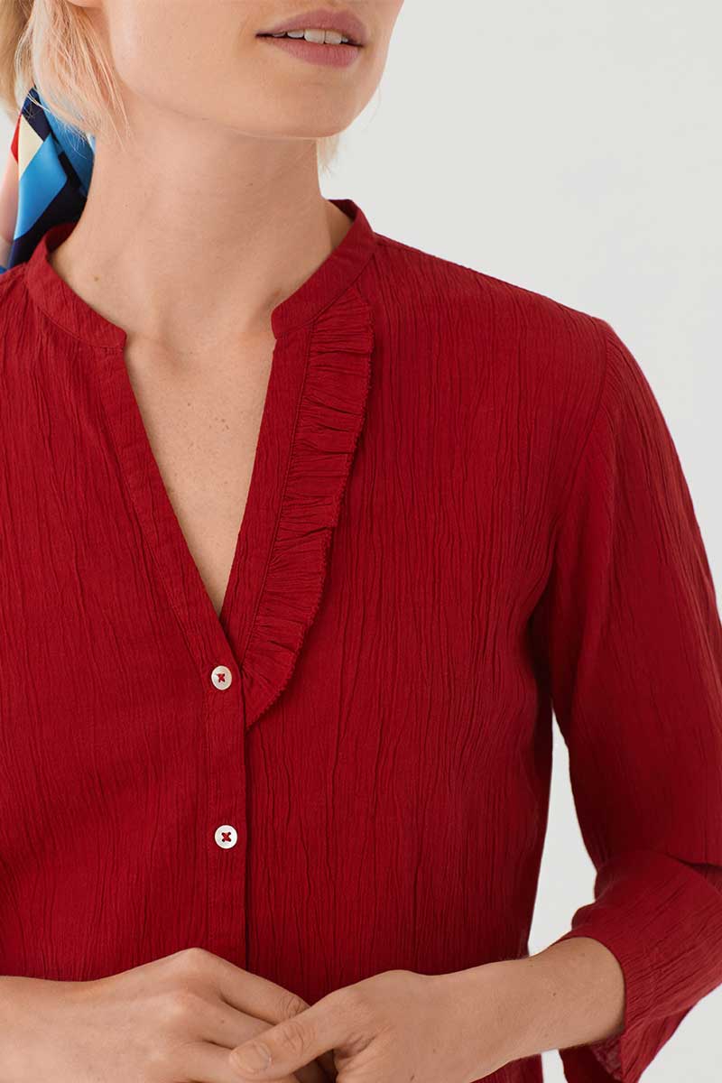 Rote Bluse Cheesecloth mit V-Ausschnitt, Rüschendetail, Mandarinkragen, Knöpfe vorderseitig und mit Dreiviertel-Ärmel.