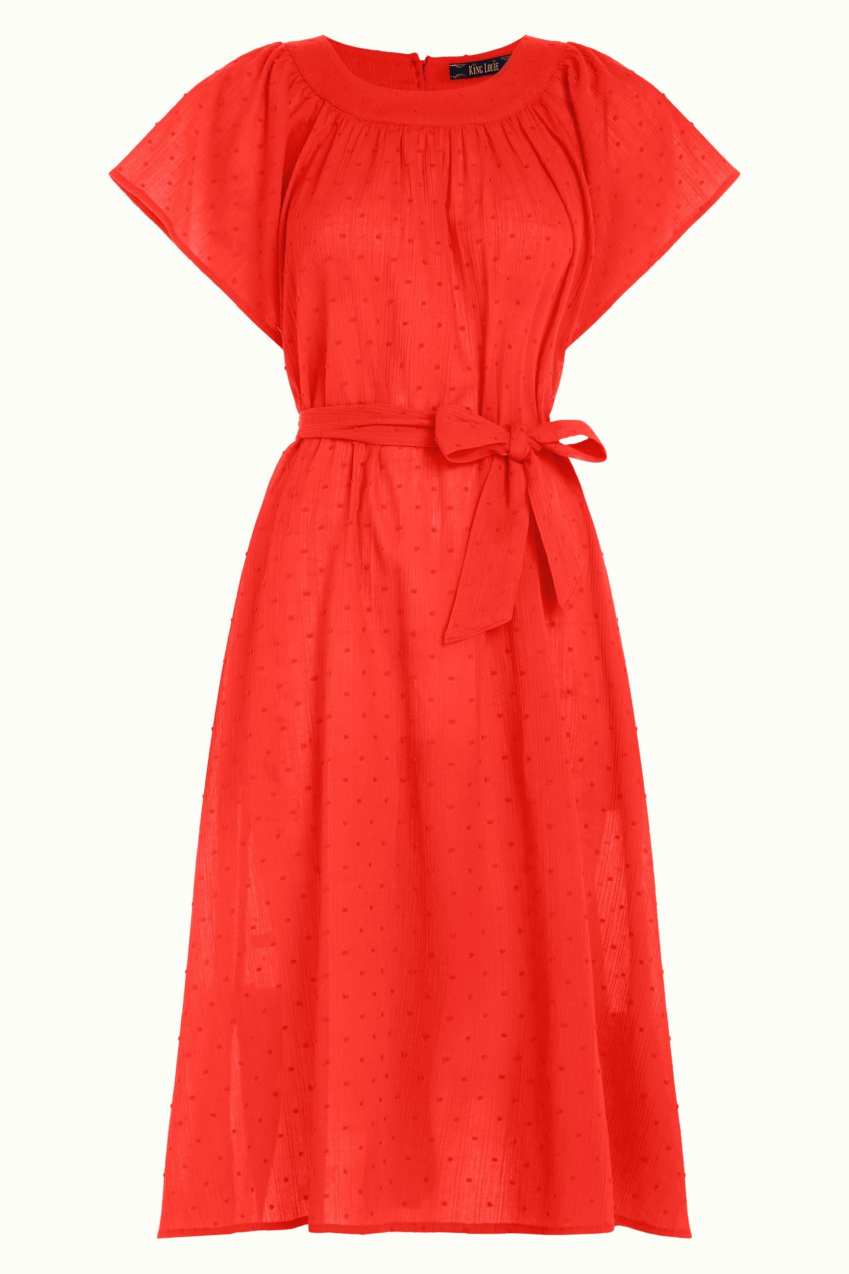 Verleihe deiner Garderobe mit diesem King Louie einen Hauch leidenschaftlicher Energie! Das sommerliche Design besticht durch eine taillierte Passform, einen Rundhalsausschnitt mit Raffungen und kurze, weite Ärmel. Der ausgestellte Rock und der Bindegürtel sorgen für eine feminine Silhouette, während seitliche Gehschlitze und die luftige Baumwollqualität für angenehmen Tragekomfort sorgen. Ein reliefiertes Pünktchenmotif verleiht dem Webstoff aus 100% Baumwolle zusätzlich das gewisse Etwas.